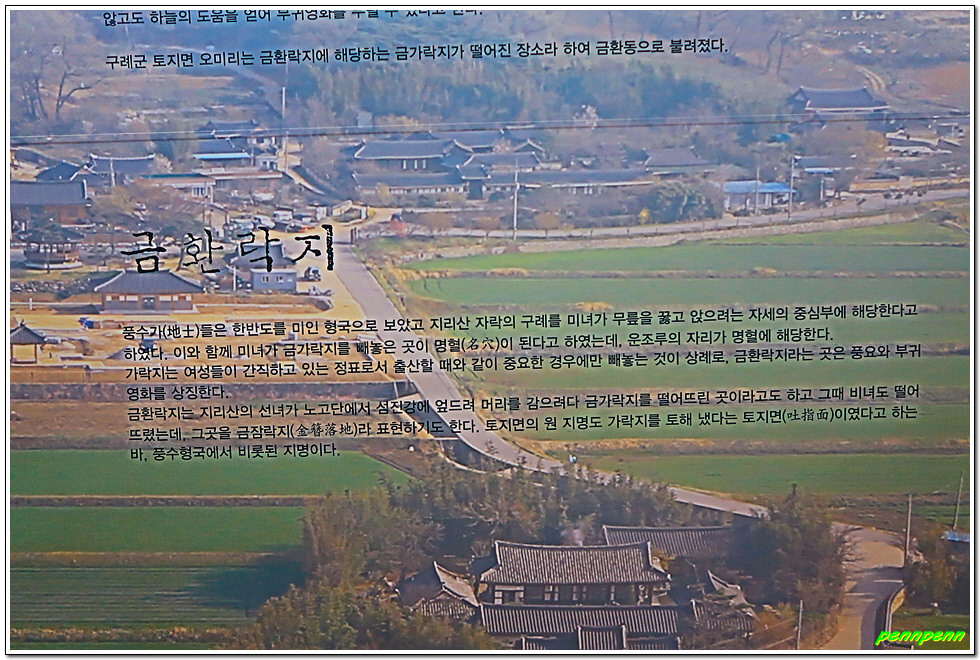 전남 구례군 토지면 오미리는 풍수지리에서 금환낙지(金環落地)의 형국이라는 남한의 3대 길지의 한곳인데 금환낙지는 금가락지가 땅에 떨어진 곳으로 부귀영화가 샘물처럼 마르지 않는 풍요로운 곳을 뜻합니다. 이곳에 세운 운조루 고택은 조선중기(1776) 낙안군수를 지낸 유이주(1726-1797)가 지은 55칸의 목조기와집으로 국가민속문화재입니다.