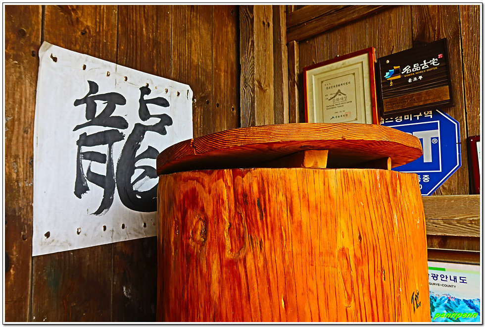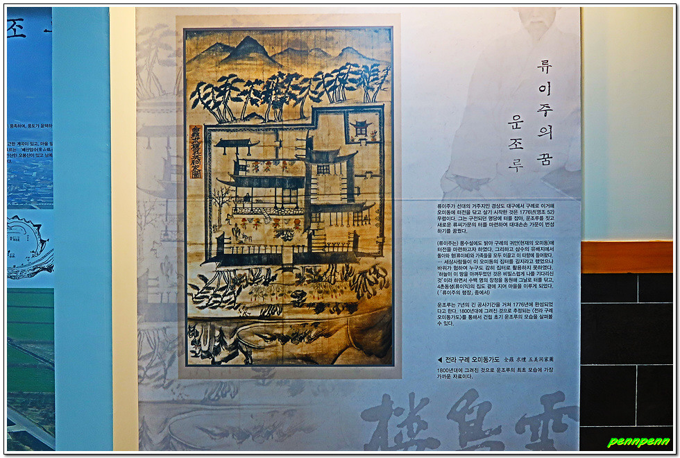 안으로 들어서면 타인능해가 표시된 큰 쌀독이 방문객을 맞아줍니다. 전시실에는 각종 도장, 운조루 현판, 서책, 운조루 배치도, 류이주가 받은 홍패교지, 류이주 영정그림도 있습니다. 홍패교지는 류이주가 1753년 무과에 최종 합격하고 받은 증서입니다. 운조루 현판글씨는 조선후기 서예가인 이익회의 글씨입니다.
