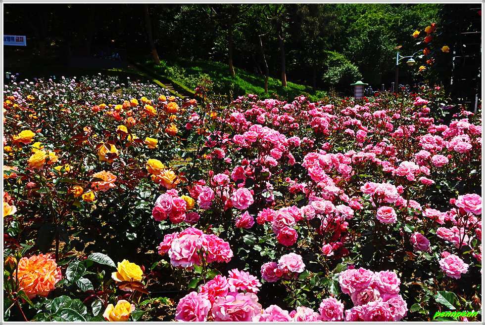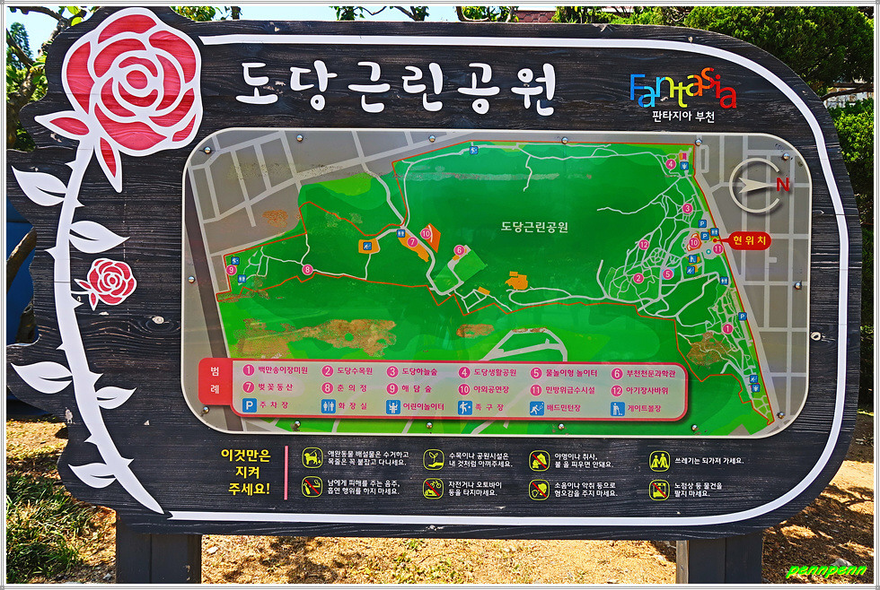 도당근린공원의 안내도가 있고 좌측에 백만송이장미원이 펼쳐집니다.