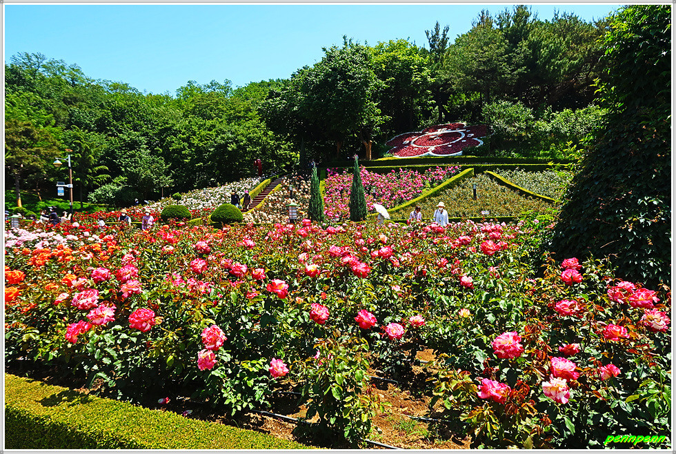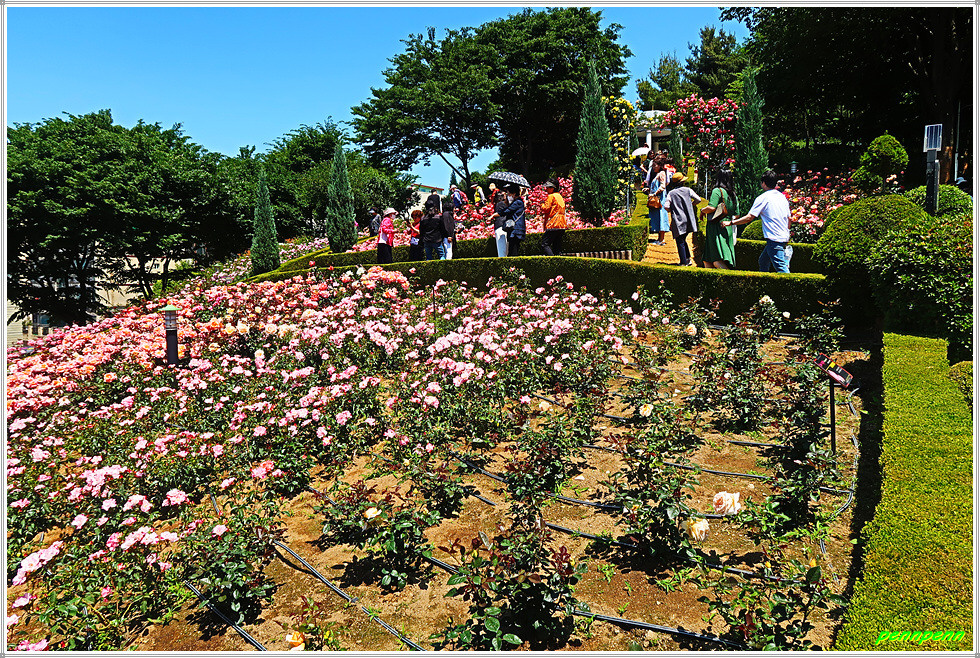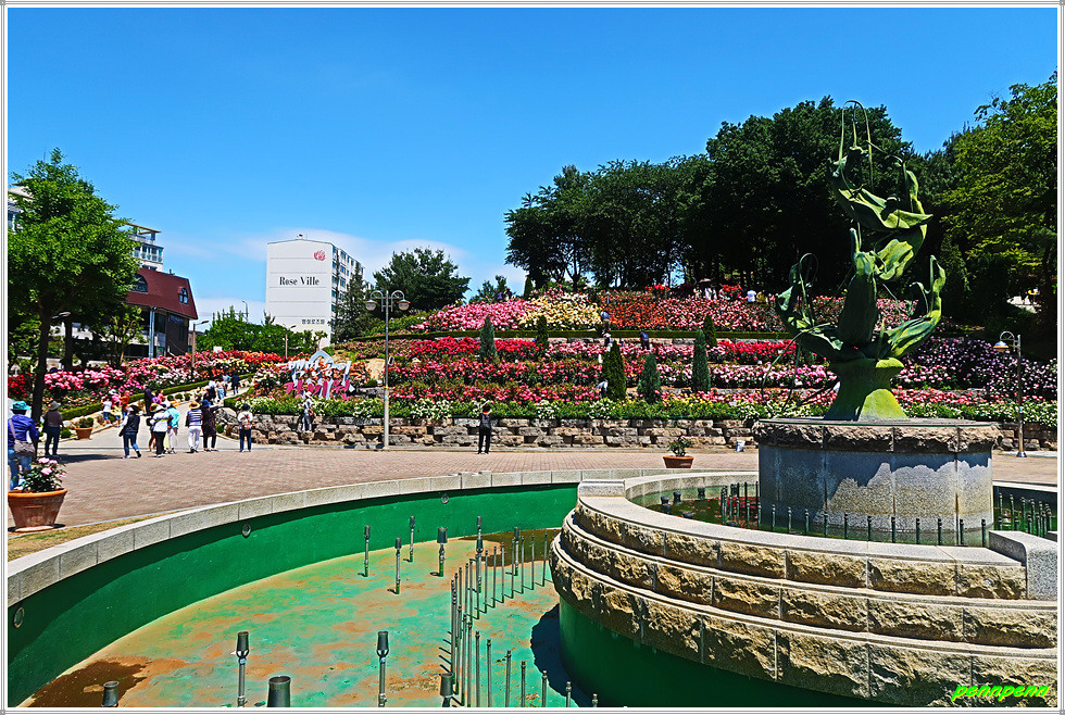 이곳에는 장미꽃 군락, 덩굴장미, 꽃 터널, 분수대,
