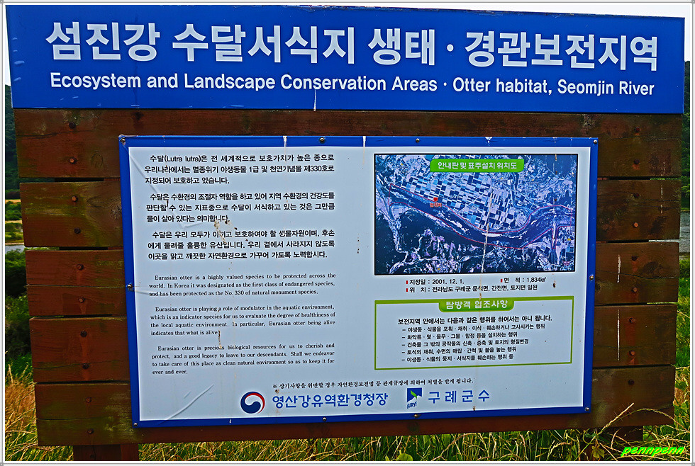 섬진강 제방에 올라 우측으로 가는 길은 “남도 이순신길 백의종군로”입니다. 이곳 섬진강은 수달서식지로 생태경관보전지역이라는군요. 수달은 전 세계적으로 보호가치가 높은 종으로 우리나라는 멸종위기 야생동물 1급 및 천연기념물로 지정해 보호하고 있습니다. 섬진강둑에서 바라본 토지면의 들녘이 매우 넓어 보입니다.