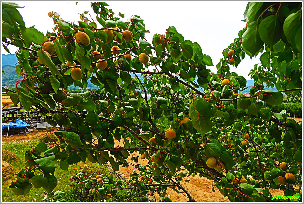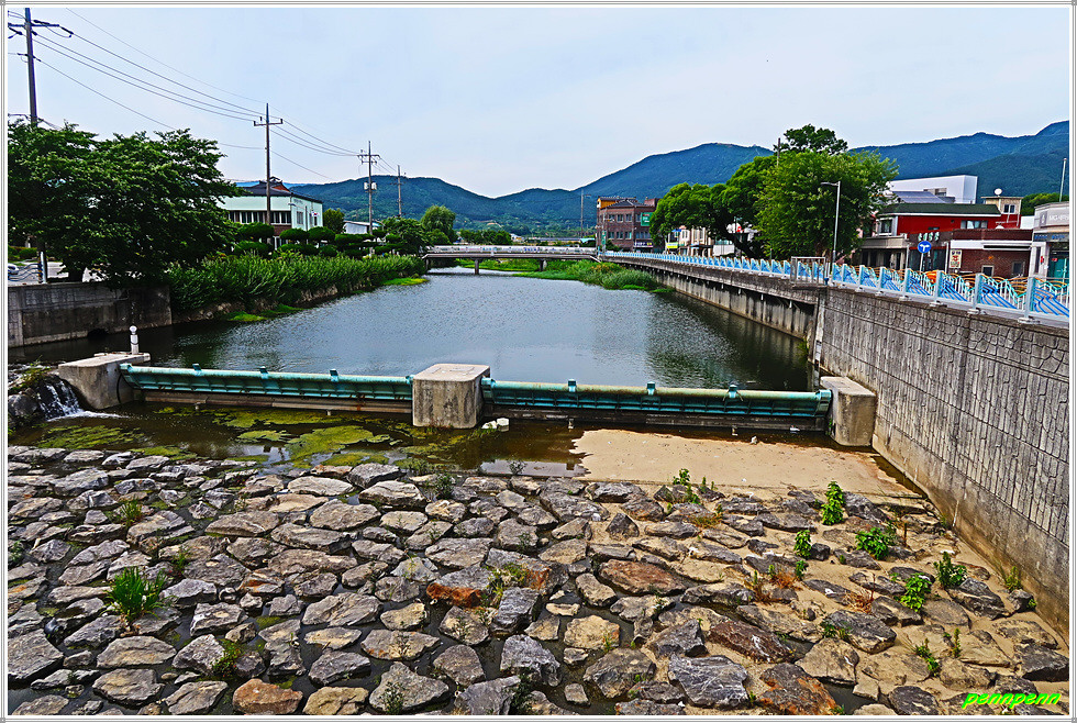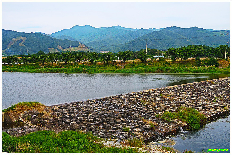 메사쉐콰이어 가로수 길을 한참 동안 걷다가 19번 국도상의 서시2교 교각 밑을 가는데 반갑게도 징검다리가 조성되어 있어 기분좋게 발걸음을 옮깁니다. 다시 서시천 제방으로 올라서면 원래 지리산 둘레길과 만납니다. 제방에는 익어가는 자두가 길손의 마음을 유혹하네요. 이곳 서시천에도 낮은 보를 조성해 물을 확보하고 있습니다.