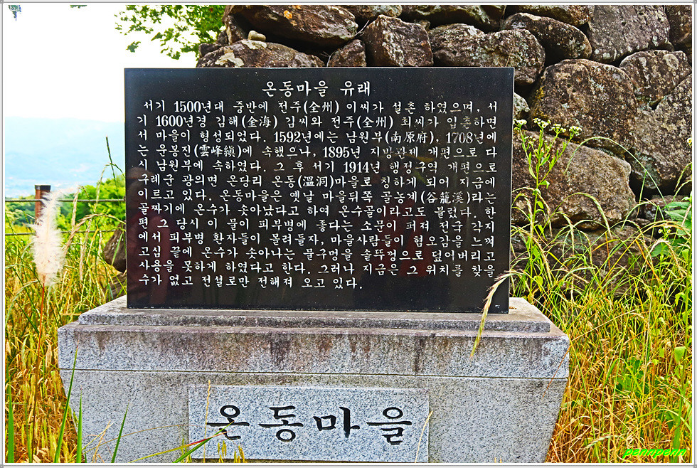 구만교를 건너 구만저수지 아래 농어촌공사가 운영하는 구만소수력발전소를 지나갑니다. 우리밀 체험관에서 좌측의 온당리로 몸을 돌려세웁니다. 구례예술인마을 이정표를 뒤로하면 온동저수지는 보강공사가 한창이네요. 온동마을은 조선말기 전주이씨가 들어와 살면서 마을이 형성됐는데, 골논계라고 하는 골짜기 샘에서 따뜻한 물이 나와 온수골이라 부르다 한자로 개칭하면서 온동이 되었습니다. 그래서인지 마을표석은 온수동이로군요. 다만 현재의 행정명칭은 온당리 온동마을입니다.