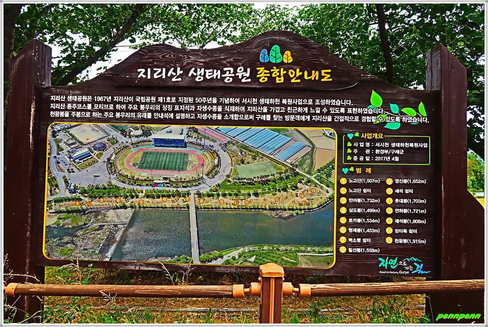 이어지는 명소는 지리산 생태공원인데 구례공설운동장 옆 서시천변에 마련된 생태공원은 지리산 주능선을 축소모형을 재현해 서쪽의 노고단에서 동쪽의 지리산 정상인 청왕봉까지 지리산 종주를 할 수 있는 체험공간입니다. 반야봉 및 제석봉 등 주능선의 봉우리들을 알리는 표석이 놓여 있는 가운데 필자도 불과 7분만에 지리산 종주를 끝냈습니다. 지리산 정상인 천왕봉의 표석을 배경으로 생애 두 번째로 기념사진을 남기는군요.