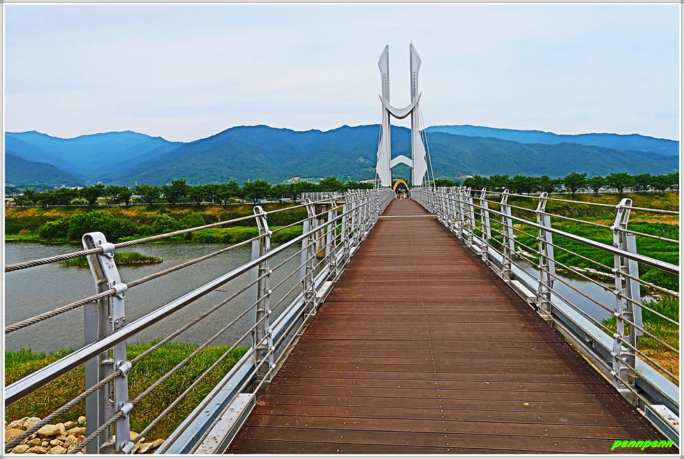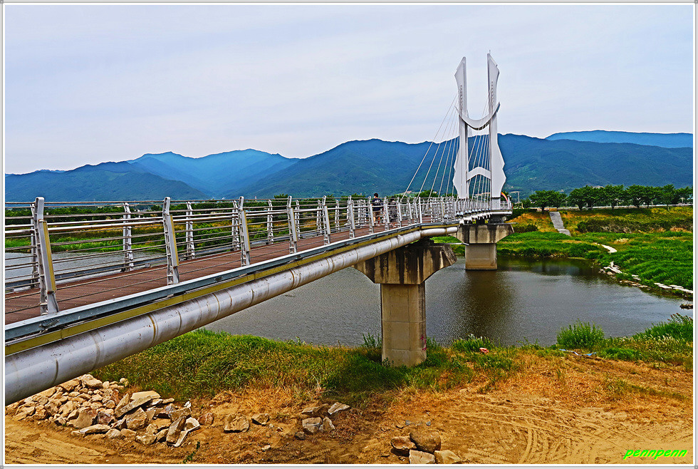 서시천공원 근린생활체육시설이 잘 갖추어져 있군요. 어린이놀이터와 서시정 정자도 군민들의 훌륭한 쉼터입니다. 서시천을 가로지르는 보행전용 사장교인 연하교의 모습이 매우 아름답군요. 연하교의 길이는 158m, 폭은 2.5m이며 주탑의 모형은 반달곰형상이라고 합니다. 지리산 둘레길 구례센터에서는 순례자들이 인증스탬프를 찍을 수 있고 관련 안내를 받을 수 있습니다.