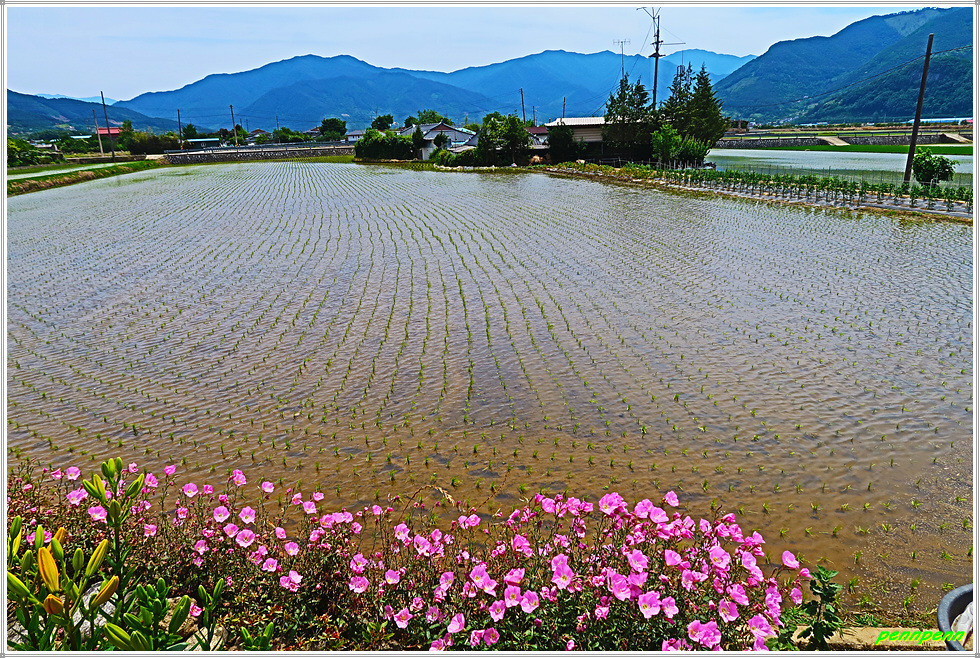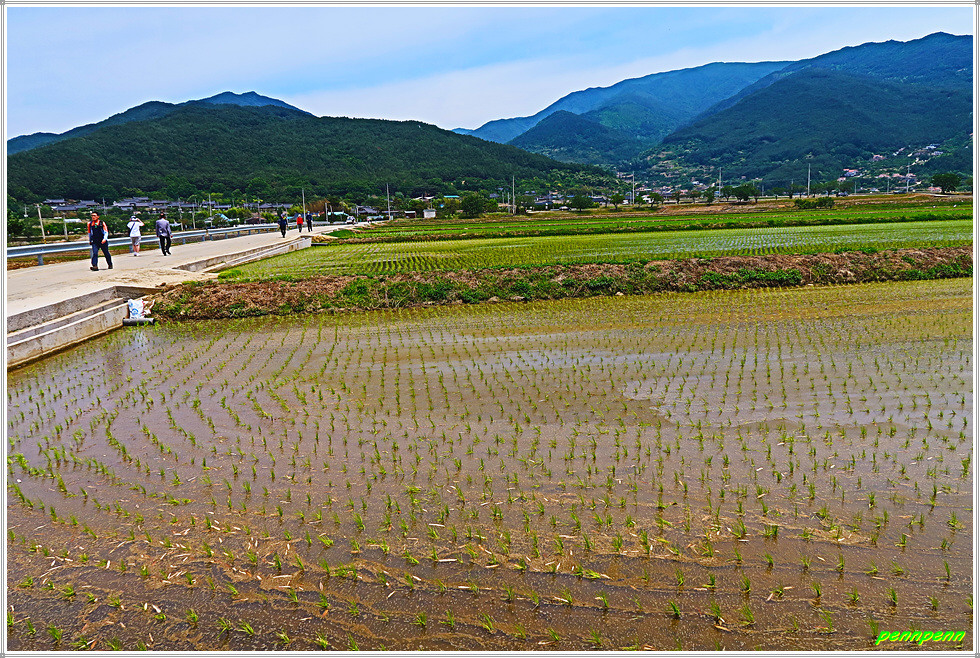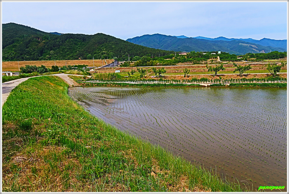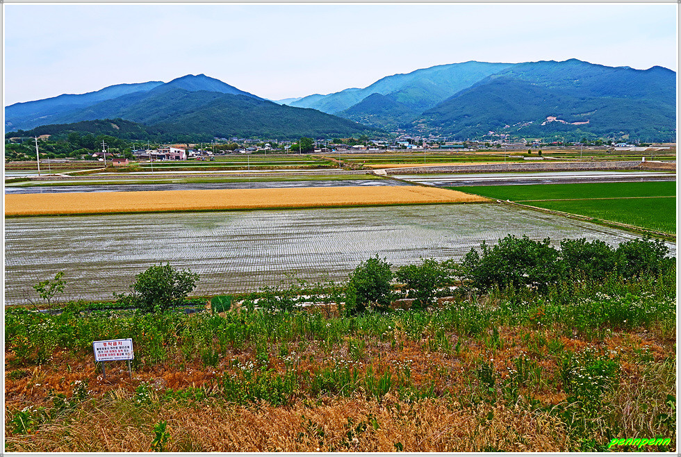19번 국도상의 원내버스정류장에서 직진해 대나무숲 좌측 길로 가면서 토지면 금내리 원내마을을 지나갑니다. 뒤돌아보니 오미마을을 상당히 멀어져 있네요. 농경지에는 이미 모내기를 한곳과 물을 대어 놓은 무논 그리고 누런 밀밭이 혼재된 상태입니다.