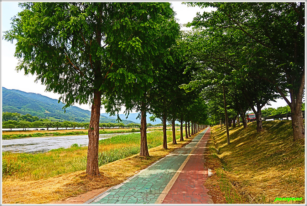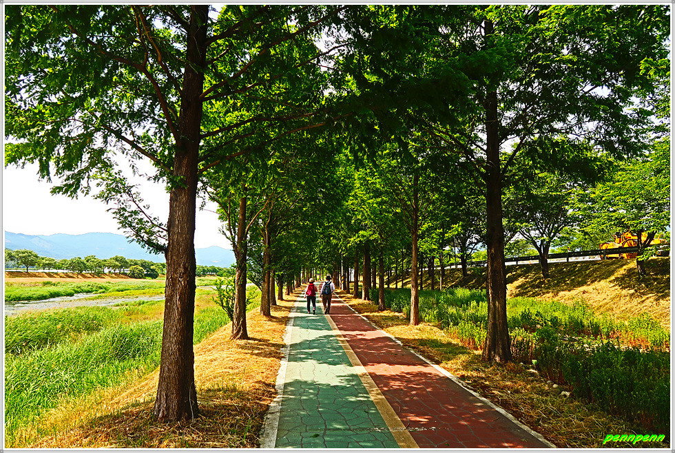 자전거길로 조성된 서시천변 길을 가면서 광의대교 옆을 통과합니다. 광의대교 맞은편은 행정구역상으로 광의면이지요. 북동쪽으로 지리산 주능선의 노고단이 아련하게 보입니다. 그런데 원래 19코스는 광의교에서 이를 건너지 말고 직진해야하지만 우리 몇몇은 광의교를 건너 맞은편 서시천변으로 갑니다. 왜냐하면 이곳에는 메타쉐콰이어 가로수가 조성되어 있기 때문입니다.