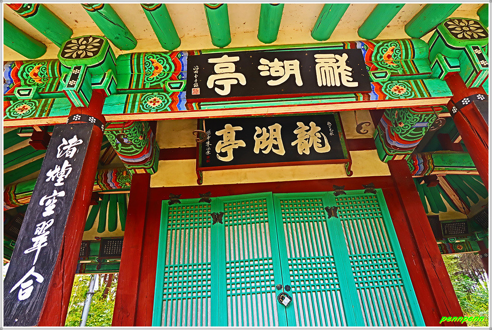 정자를 뒤로하고 제방 아래로 내려와 나무데크 길을 가노라니 용호정인데, 이 정자는 경술국치(1910) 이후 구례군의 뜻 있는 유림들이 모여 항일울분을 달래기 위해 1917년 건립한정자로 그 이후 4차례의 보수를 거쳐 오늘에 이르고 있습니다. 문루에 용호정이라는 두 개의 다른 현판이 걸려 있는 것은 아마도 보수할 때 새로운 현판을 내걸었던 같습니다. 이곳에 19코스 인증 스탬프가 비치되어 있네요.