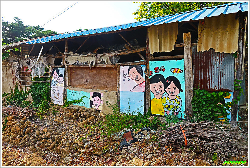 온동마을을 뒤로하고 목적지인 난동마을로 갑니다. 난동마을은 해발고도가 다소 높은 곳에 자리잡고 있군요. 폐가 같은 곳에 벽화가 보이는게 이채롭습니다. 난동마을은 1500년 경 마을 뒤에 있던 난약사라는 절 주변에 사람들이 모이기 시작하면서 마을이 형성됐으며, 본래 난약사의 난자를 따서 난약골이라 했는데, 한자로 바꿔 난동이라 부르게 되었답니다. 수령 290년의 보호수 느티나무, 난동마을회관, 난향정을 지나면 19코스 종점입니다.