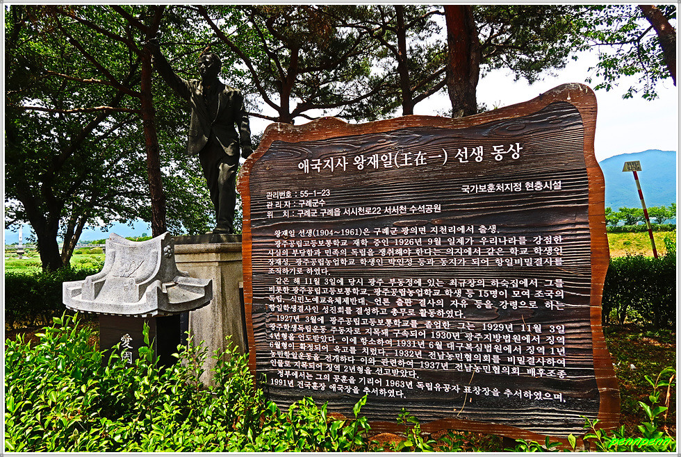 정자를 뒤로하고 계속해 발걸음을 옮깁니다. 멀리 구례읍내의 시가지가 보이기 시작하는군요. 섬진강에도 강심에 낮은 보을 쌓아 물을 저장하고 있는 모습입니다. 드디어 섬진강과 합류하는 서시천입니다. 잠시 후 서시천을 가로지르는 서시교를 건너 구례읍내로 진입합니다. 지나가는 길목에는 애국지사 왕세일 선생(1904-1961)의 동상이 세워져 있군요.