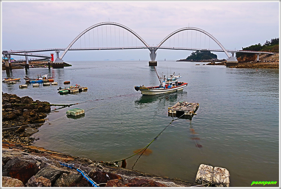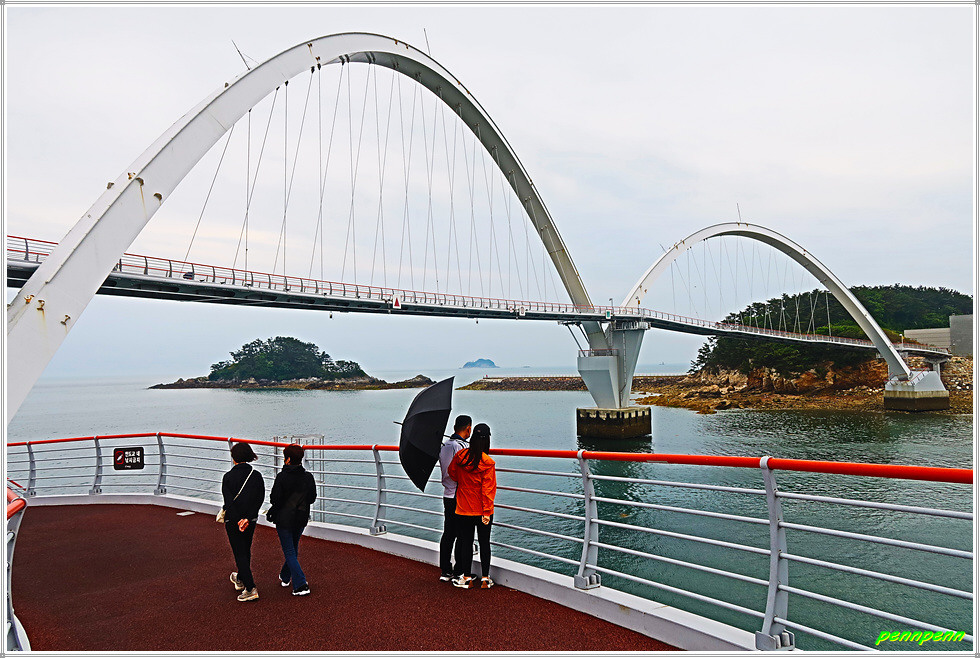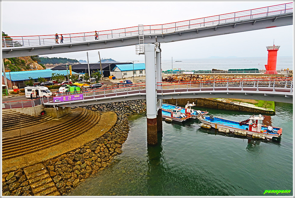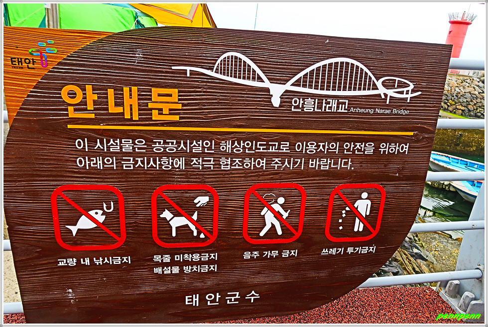 안흥항의 새로운 명물이 된 안흥나래교는 태안군의 군조(郡鳥)인 갈매기를 본떠 다리모양을 만들고 날개를 활짝 펴는 모양을 상징하는 뜻에서 이름 붙인 다리로 공사비는 무려 174억원이 소요되었답니다. 다리의 총연장 293m, 폭은 4m로 2017년 개통했습니다.