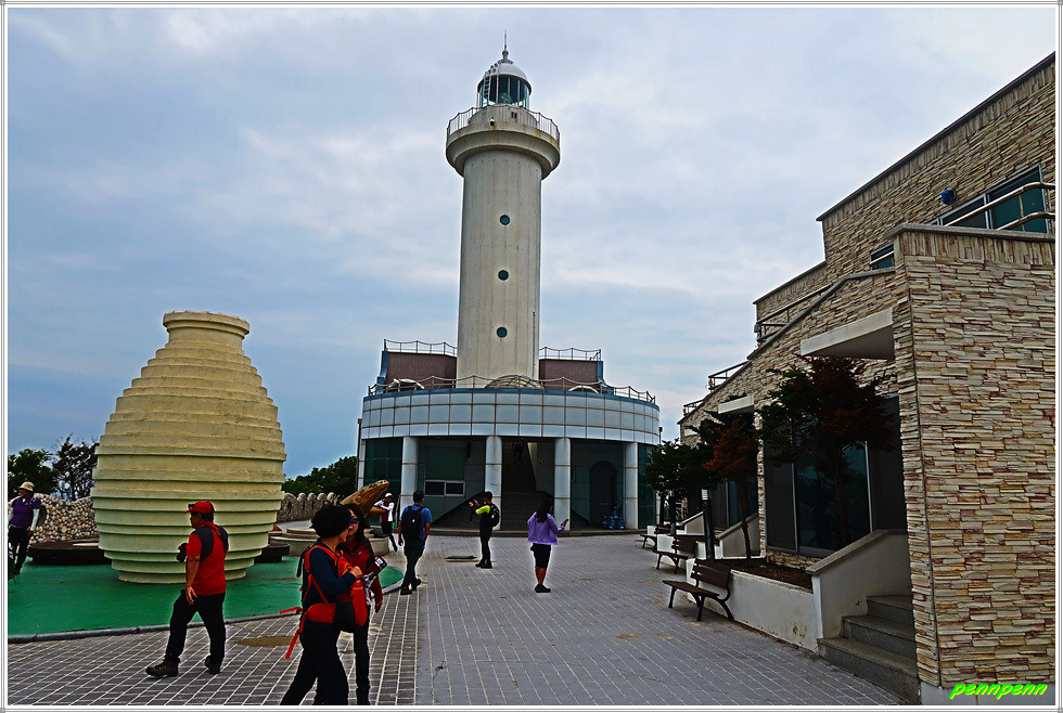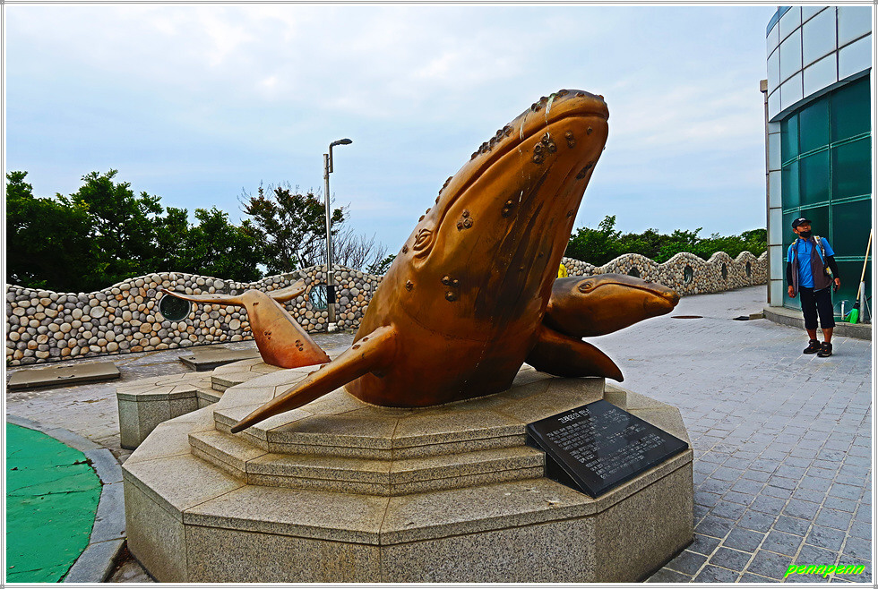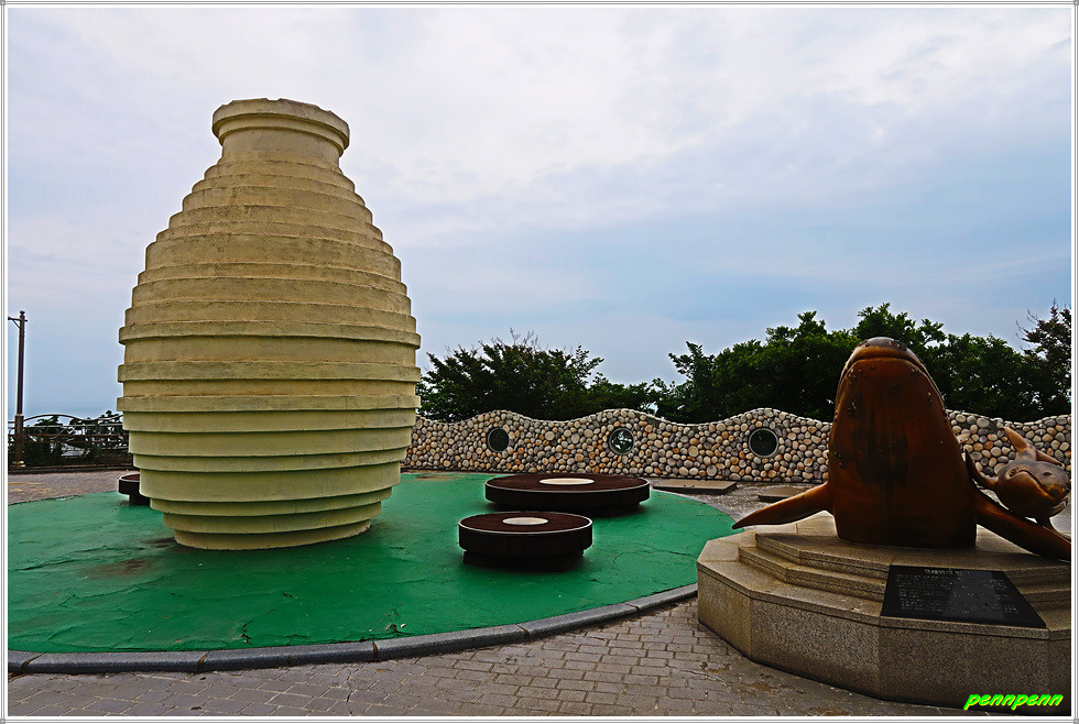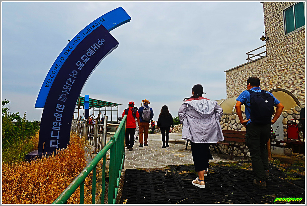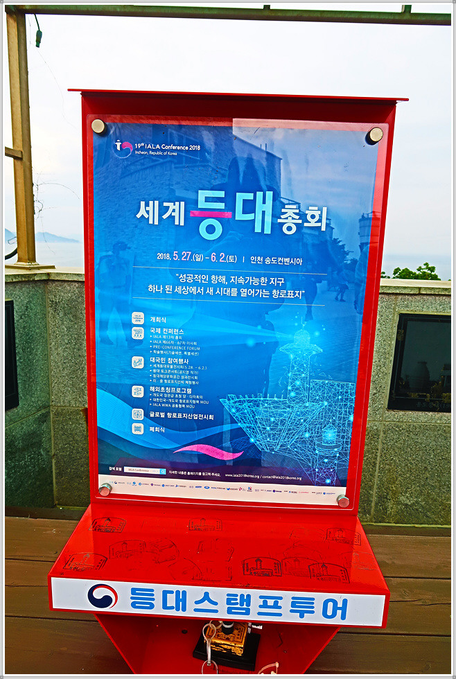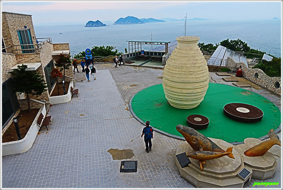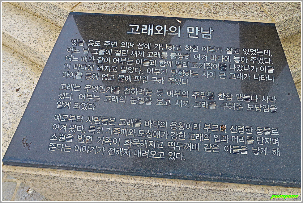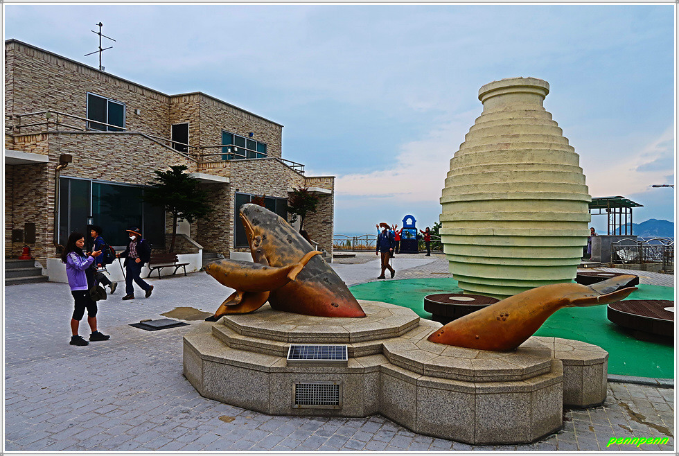 이어서 옹도방문 환영아취를 지나면 바로 옹도등대 앞 중앙광장인데, 이곳에는 옹기조형물과 고래조형물이 있습니다. 그리고 등대스탬프 투어인증용 스탬프도 비치되어 있군요. 고래조형물에는 “고래와 어부의 만남”이라는 이야기 거리가 있네요. 등대동은 전시관과 하늘전망대로 구성되어 있는데 출입금지상태입니다. 단 2층에서 중앙광장을 내려다 볼 수 있음은 보너스로군요.