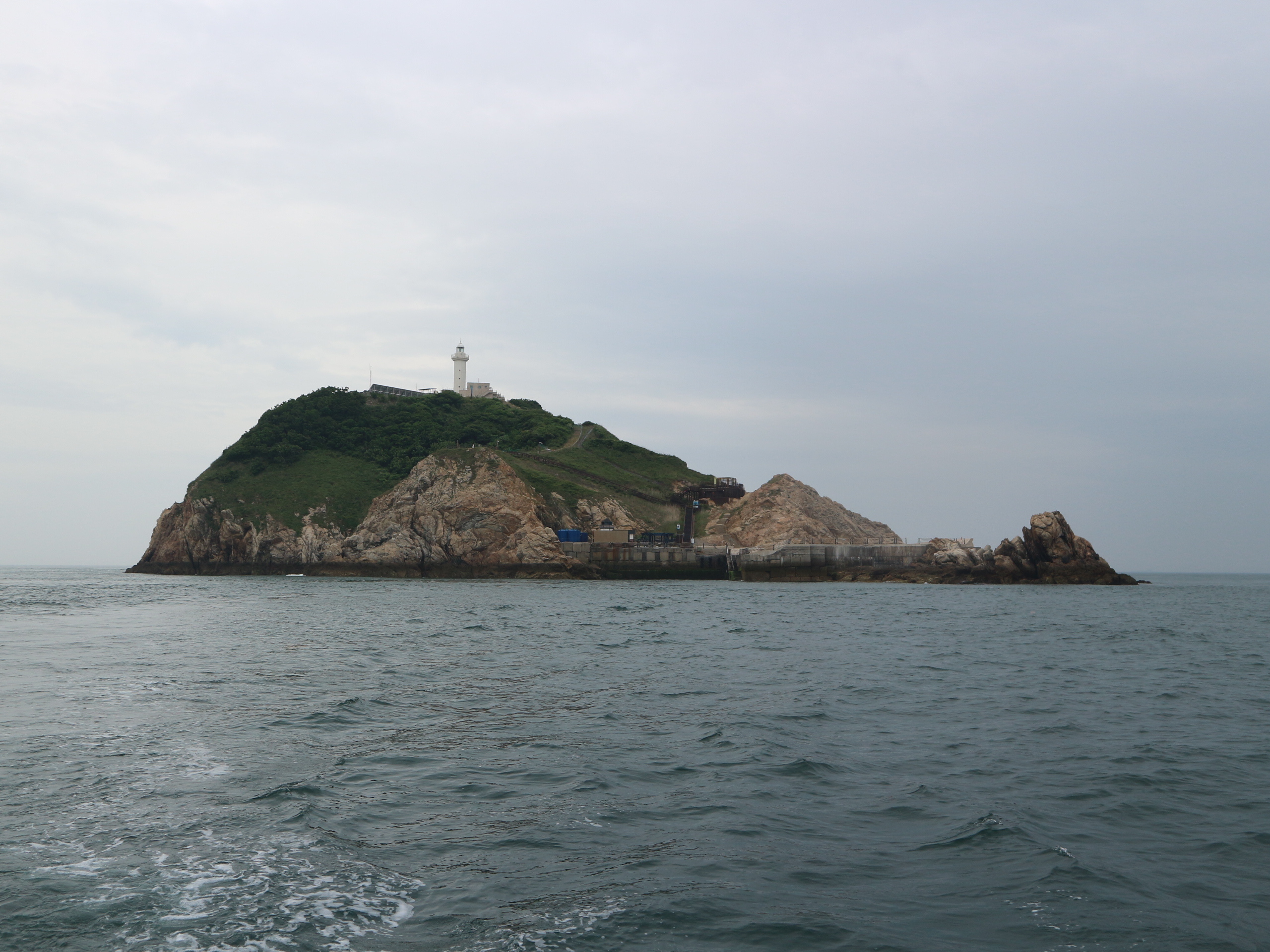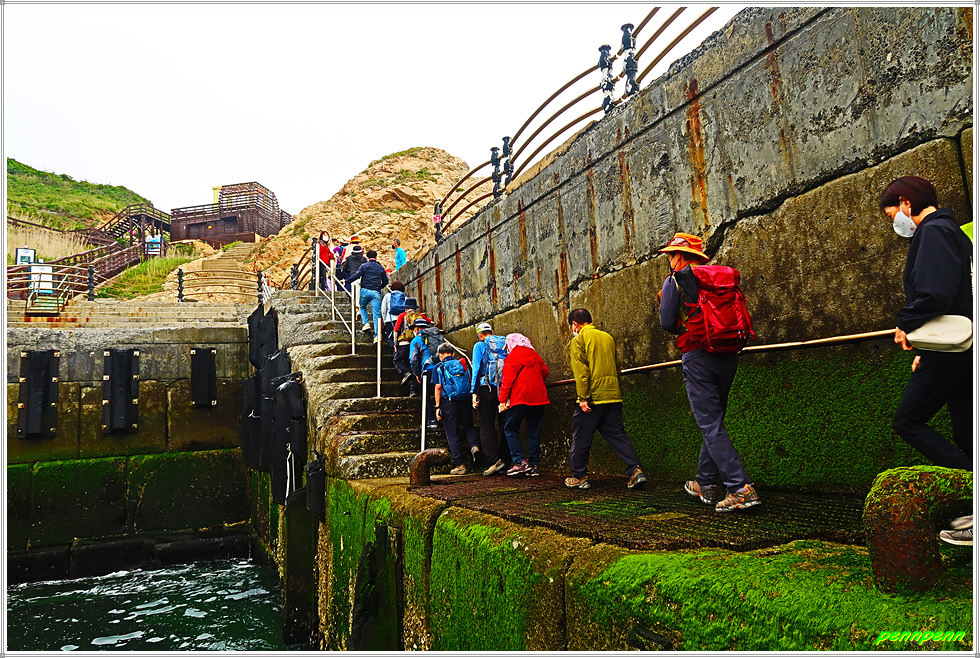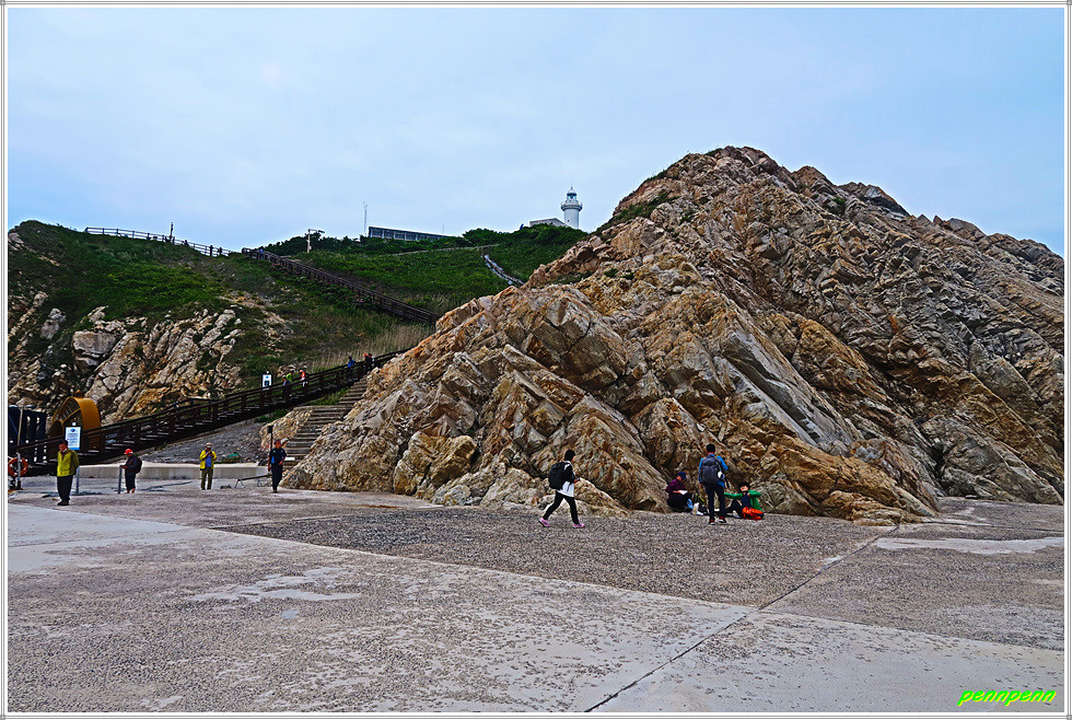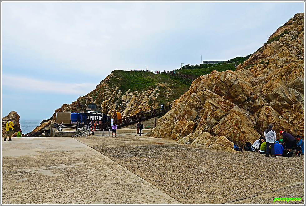 옹도선착장에 도착해 뭍으로 오릅니다. 선장은 승객들에게 하선한 후 30분 동안 시간을 주면서 등대투어를 마치고 곧 바로 출발한다는군요. 부두 옆에는 삼각형 모습의 기암이 있네요. 선착장에서 하선하는 승객들의 모습을 보니 제대로 된 선착장이 아니라 매우 조악한 간이선착장 같습니다.