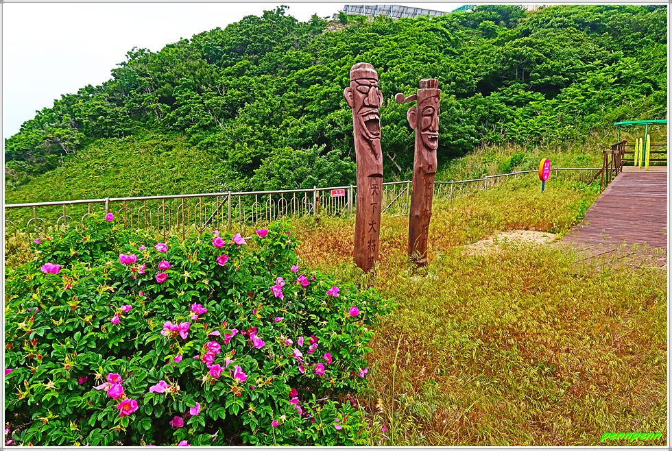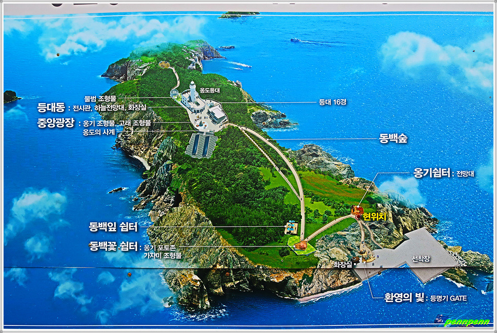계단을 다 오르면 바로 앞에 장승2기가 서 있고 그 좌측에는 옹도를 상징하는 옹기포토존이 있습니다. 동백잎 쉼터에는 출입을 금지하고 있네요. 동백숲 터널로 진입해 금방 빠져 아옵니다.