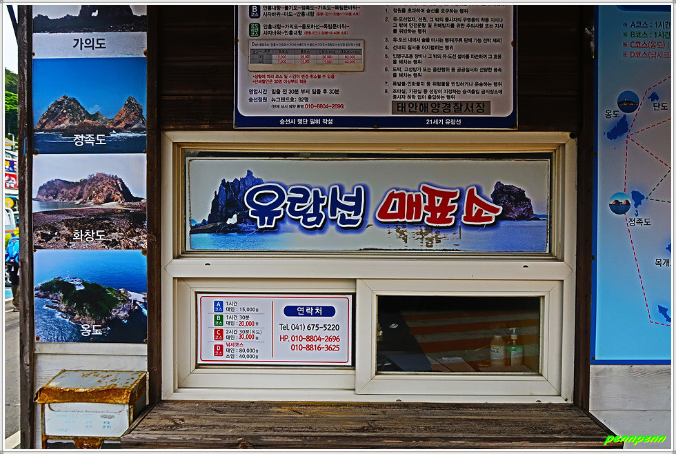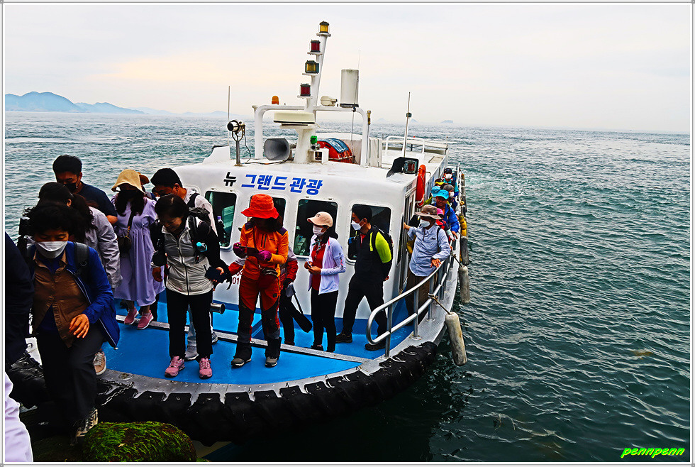 옹도행 유람선의 출발지는 태안군 근흥면 신진도리 소재 국가어항인 안흥항(安興港, 안흥내항)으로서 이곳에 있는 21세기관광유람선이 현재 유일하게 옹도행유람선을 운항합니다. 우리 일행은 오후 2시에 출발하는 유람선에 승선했는데 약 30분 후 옹도에 도착합니다. 그런데 태안앞바다는 진도 울돌목 다음으로 해상유속이 빨라서 풍랑이 세기 때문에 결항하는 경우가 많은데 유람선 선장은 우리에게 복이 많다고 하더군요. 그래도 배가 제법 흔들리는 것 같아서 마음이 조마조마했습니다.