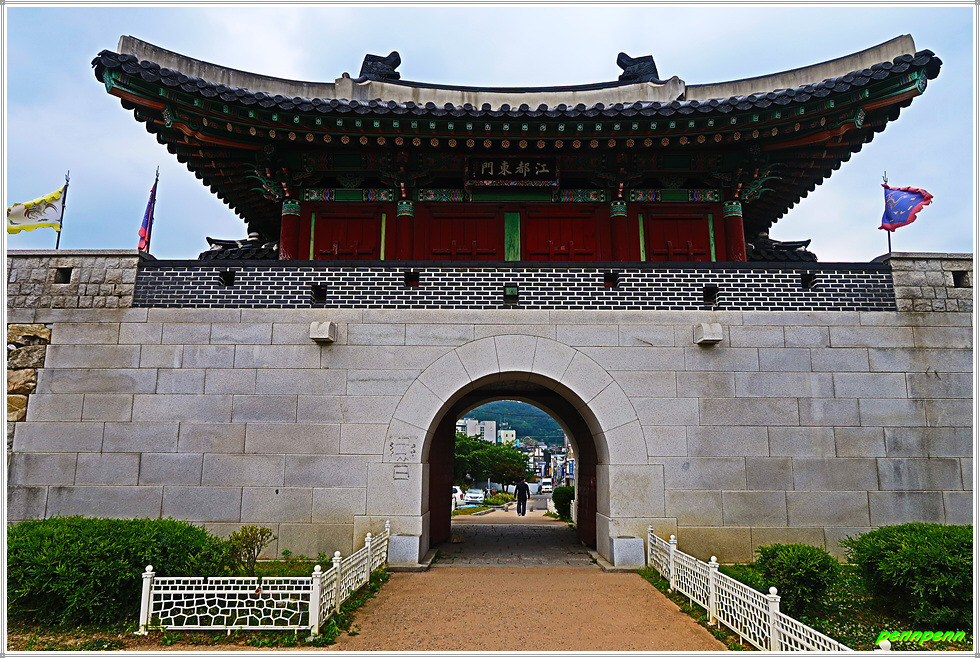 강화군청 우측으로 돌아 자그마한 고개를 넘어가면 강화산성 동문인 망한루(望漢樓)입니다. 강화산성은 고려가 몽골의 침입에 대항하여 개경에서 강화도로 천도한 때인 강도(江都) 시기(1232~1270)에 조성된 산성으로 내성과 외성 및 중성이 있었는데 내성은 현재의 강화성으로 둘레가 7,122m입니다. 강화산성에는 안파루(남문), 첨화루(서문), 망한루(동문), 진송루(북문)의 사대문과 암문, 수문, 장대 등의 방어시설이 있습니다. 이곳 망한루의 뒤쪽에는 강도동문이라는 현판이 붙어 있더군요.