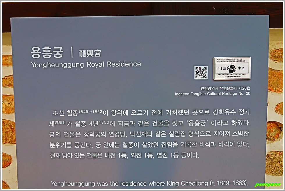 성공회 강화성당을 나오면 아래쪽에는 용흥궁이 있는데 이는 조선 철종(哲宗, 재위 1849~1863)이 왕위에 오르기 전에 거쳐하였던 잠저(暫邸)로 강화유수 정기세가 철종 4년(1853) 지금과 같은 건물을 짓고 용흥궁이라고 하였습니다. 좁은 골목 안에 대문을 세우고 행랑채를 두고 있어 창덕궁 낙선재와 같이 소박한 분위기를 풍깁니다. 용흥궁 옆의 잔디밭은 용흥궁공원이지요.