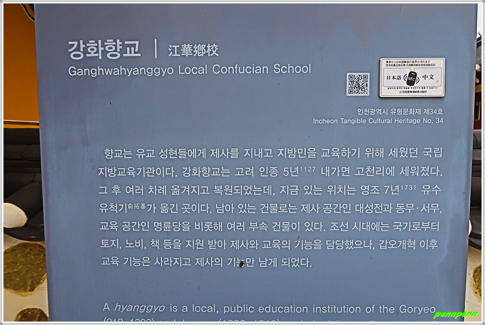 고려궁지에서 서쪽의 북관제묘로 갑니다. 지나가는 길목에는 수령 728년의 보호수 은행나무가 우람하게 버티고 있습니다. 그런데 북관제묘는 어디에 있는지도 모른 채 그냥 지나칩니다. 강화여고 옆의 강화향교는 공사 중이어서 출입문이 굳게 닫혀 있더군요. 강화향교는 성현들에게 제사지내고 지방민의 교육을 위해 세웠던 국립교육기관으로 고려 인종 5년(1127년)에 세운 것입니다.