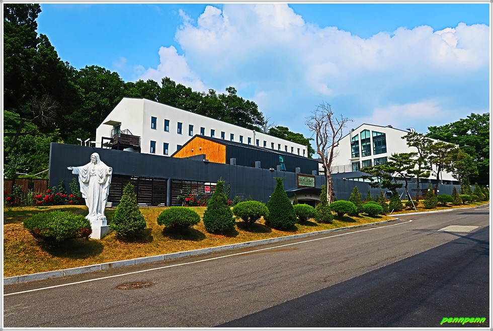 진달래꽃길 방면으로 조금 내려서면 삼거리 갈림길인데 여기서 좌측의 오읍약수터로 갑니다. 내려서는 길이 상당히 가파르군요. 숲을 빠져나온 후 대산침례교회를 지나 금계국이 피어 있는 48번 국도의 교각 밑을 통과하면 대산2리 마을회관입니다. 오읍약수터는 그냥 지나친 듯합니다. 먼지가 흩날리는 공사장을 지나 우측으로 몸을 돌려세우면 다시 숲길이네요.