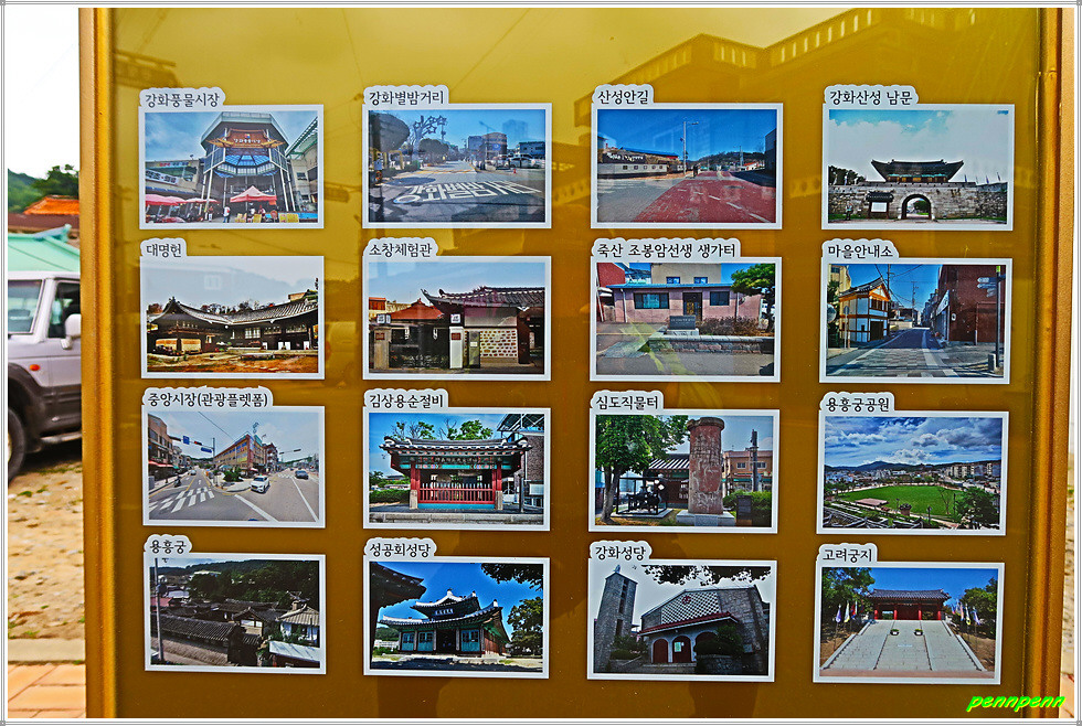 동문 앞쪽으로 나오자 처음으로 강화나들길 공식 이정표와 강화도심의 중요 역사유적지 사진을 만납니다. 강화기둥교회를 지나 좌측으로 가면 대한성공회 강화성당입니다. 이 성당은 대한제국시기에 건립된 한옥 형태의 성당으로서 성당 내외부에는 서양식 장식이 거의 없는 순수한 한식 목조건축이면서도 교회기능에 충실한 내부공간을 연출한 보기 드문 성당입니다.