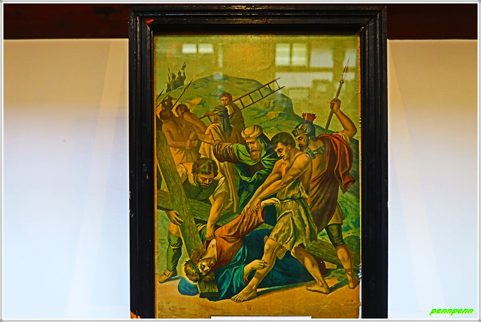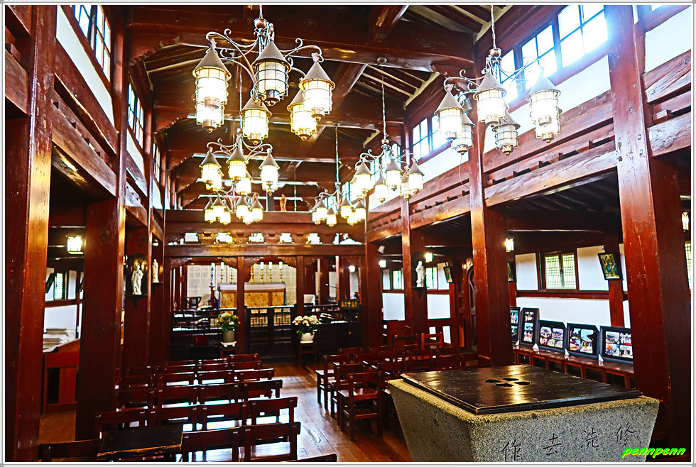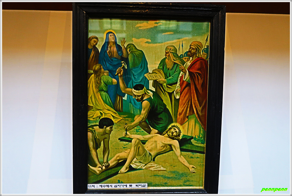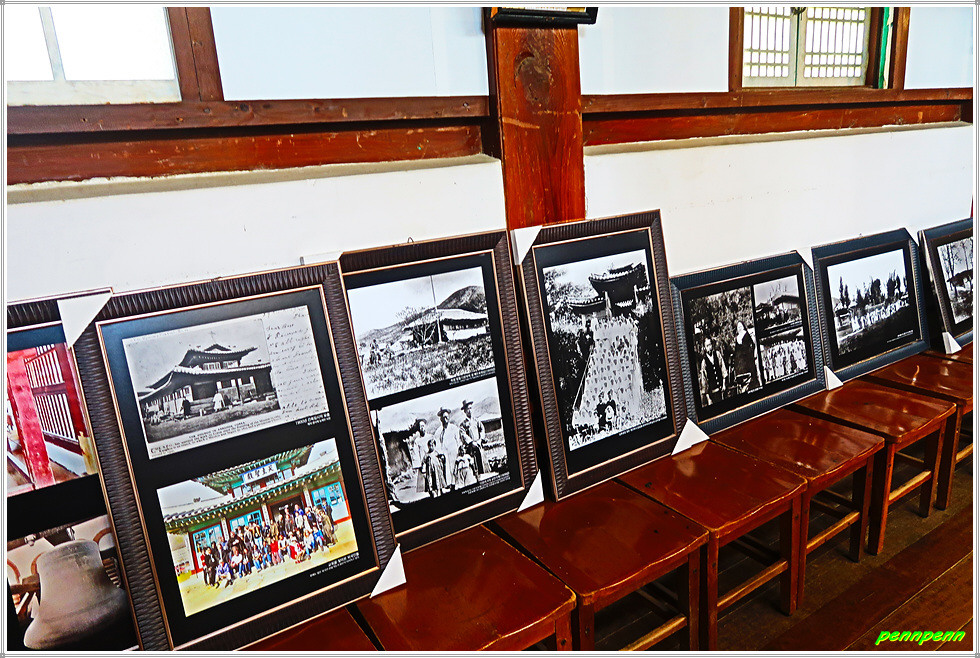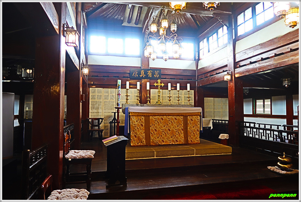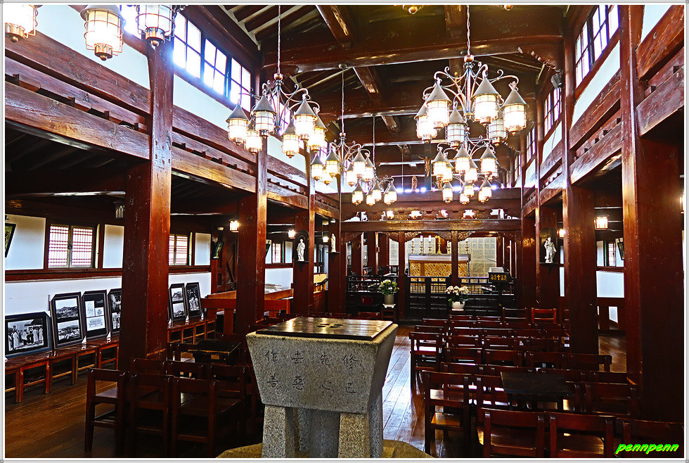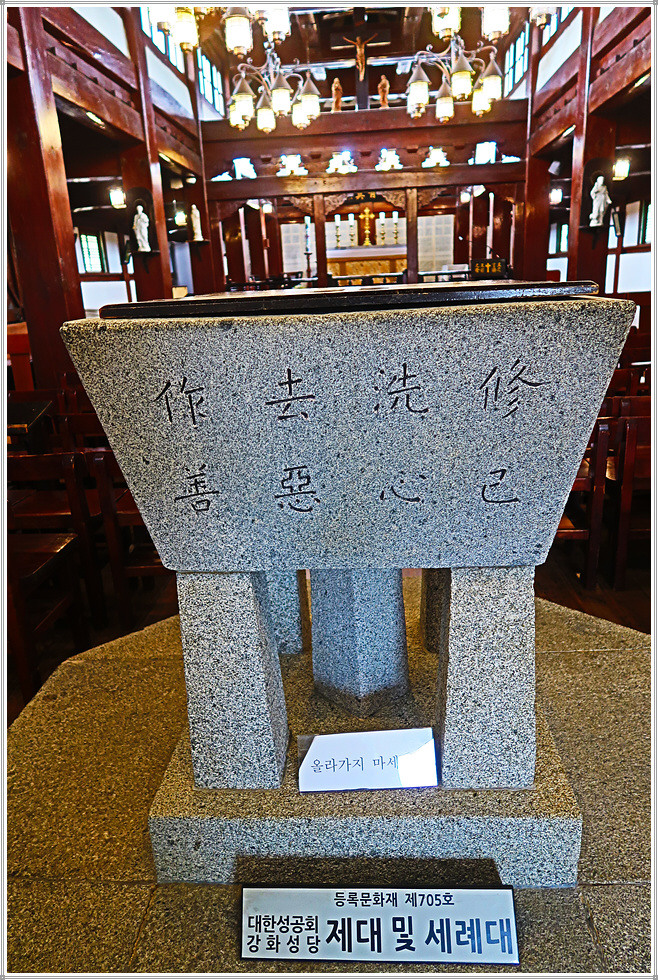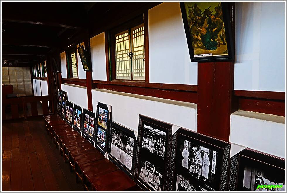 5개의 전면 기둥에는 주련(柱聯)이 씌어져 있는데 주련은 기둥이나 벽 따위에 장식 삼아 세로로 써서 붙이는 글씨를 말하며, 주련이 있음도 불교사찰을 연상시킵니다. 성당내부는 목재로 지어진 것 이외에는 서양식 성당의 구조와 흡사하군요. 코로나 거리두기가 폐지된 때문인지 성당문은 열려있고 내부는 불까지 밝혀져 있어 종교에 문외한인 필자도 경건한 마음으로 내부를 둘러봅니다. 좌우 벽면에 있는 성당과 관련된 오래된 사진과 성당에서 흔히 보는 성스러운 사진 등을 꼼꼼하게 살펴보았습니다.