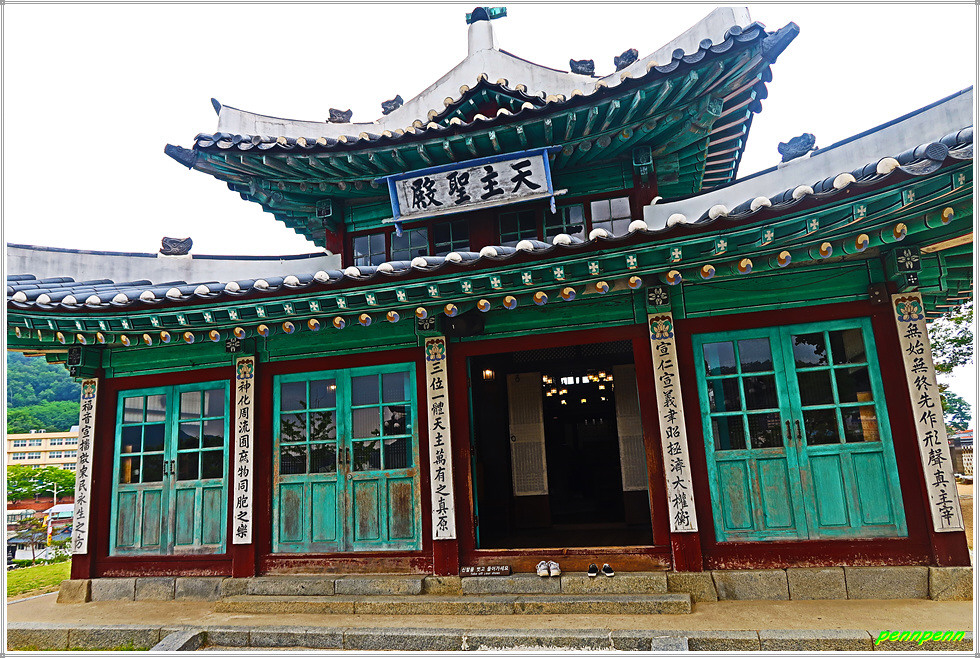 보통 성당(교회 포함)이라고 하면 종루(鐘樓)가 뾰족한 첨탑의 형태로 된 건축물을 떠올리는데 성당의 용마루 위에 십자가와 천주성전(天主聖殿) 현판만 없었다면 성당이라기보다는 전통한옥 또는 조선시대 향교와 유사한 모습을 하고 있습니다.