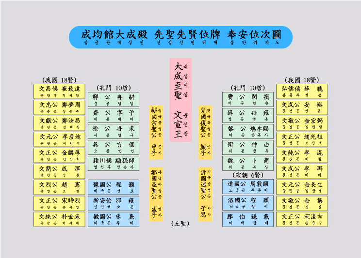 경내에는 중국의 5성과 한국 18현의 위패를 모신 대성전과 강의를 하던 명륜당 및 내·외삼문 등이 있고, 동·서무는 터만 남아 있는데 현재의 건물들은 근래에 중수 또는 신축된 것입니다. 조선시대에는 국가로부터 토지·노비·책 등을 지원받아 제사와 교육의 기능을 담당했으나, 갑오개혁이후 교육기능은 사라지고 지금은 제사의 기능만 남아 있습니다.