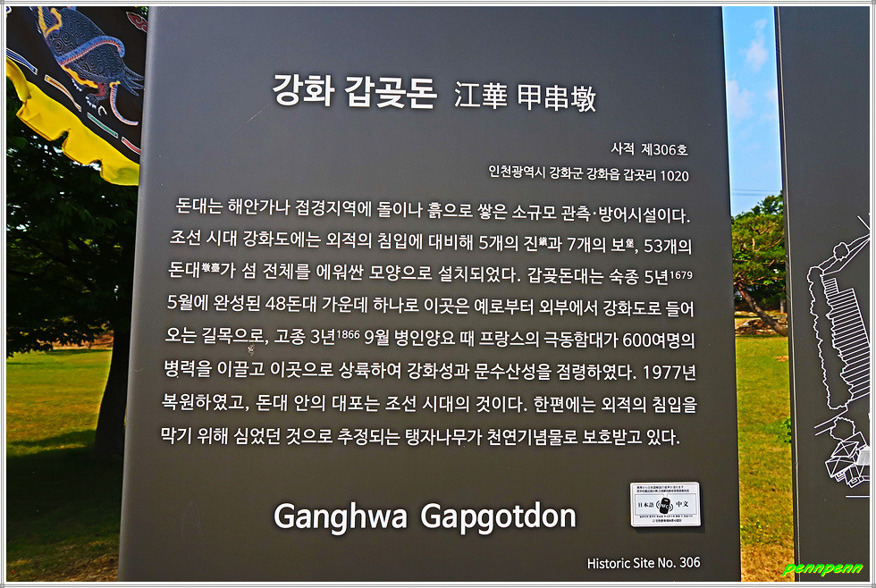 갑곶돈대는 과거에는 군사시설이었지만 지금은 마치 공원처럼 잘 꾸며져 있어 강화의 역사를 배우며 나들이 장소로도 손색이 없을 것입니다. 이곳은 강화나들길 1코스(심도역사문화길)의 종점이자 2코스(호국돈대길)의 출발점이기에 나들길 순례자들은 반드시 거쳐야하는 명소입니다.