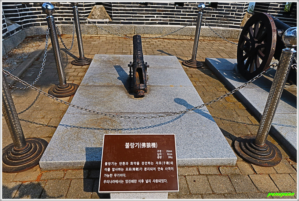 이섭정 옆에는 대포가 전시된 전각이 있는데, 이 대포는 화약과 포탄을 장전한 다음 뒤쪽 구멍에 점화하여 사격하는 방식으로 사정거리는 700m 정도로 포탄자체가 폭발하지 않아 위력을 약했습니다.