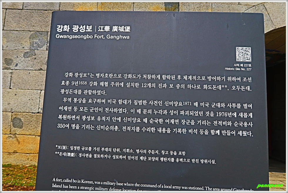 광성보에는 당시에 사용한 대포와 포대가 남아 있고 또 성과 성문, 포대 및 돈대를 잘 복원해 놓아 아이들을 데리고 답사할 경우 산 역사의 교육현장실습장으로 손색이 없으며, 강화해협(염하)의 바다를 내려다보는 전망도 참 좋은 곳입니다.