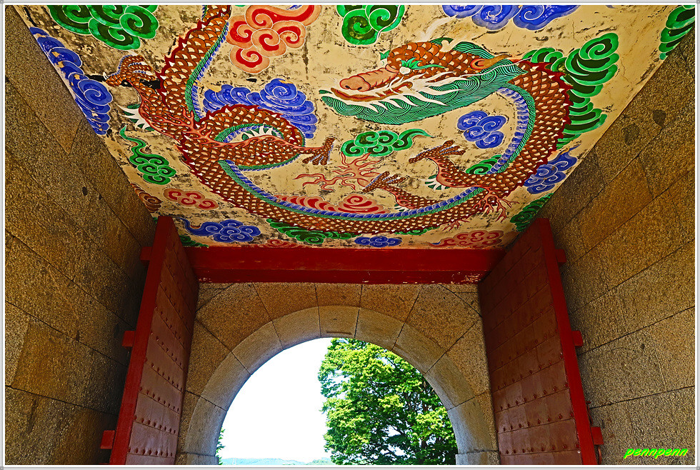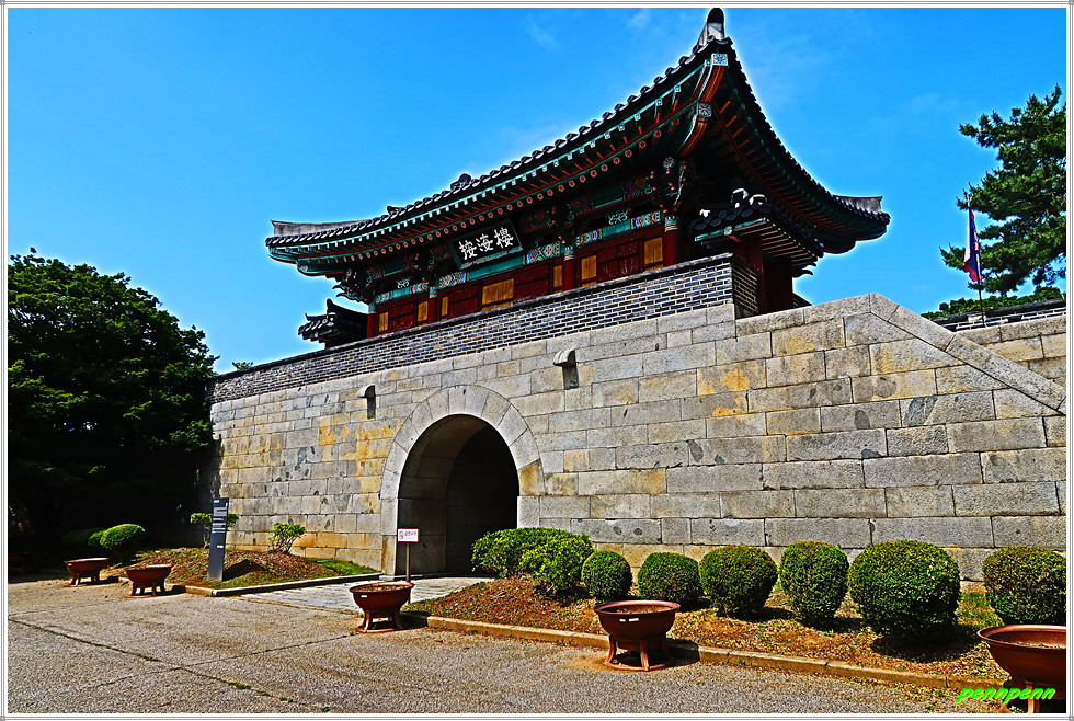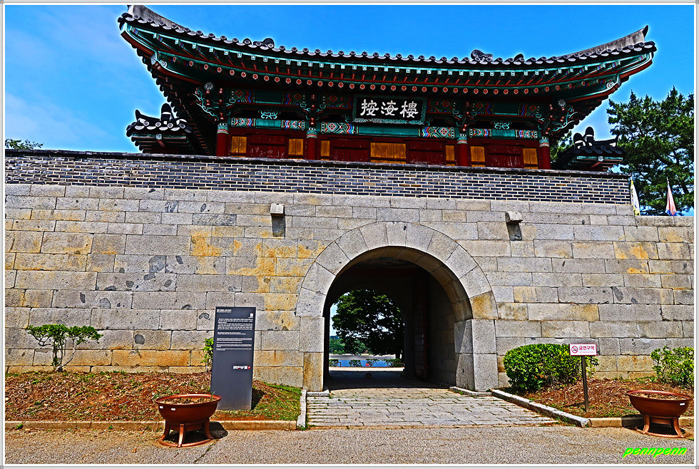 관리사무소를 통과하면 제일 먼저 눈에 뜨이는 건축물이 안해루(按海樓)입니다. 안해루는 그간 토성이었던 갓을 1745년 완전한 석성으로 개축하면서 만든 성문입니다.