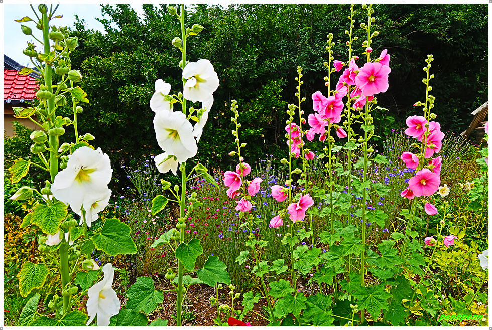 분홍색, 흰색 꽃이 무리를 지어 핍니다.