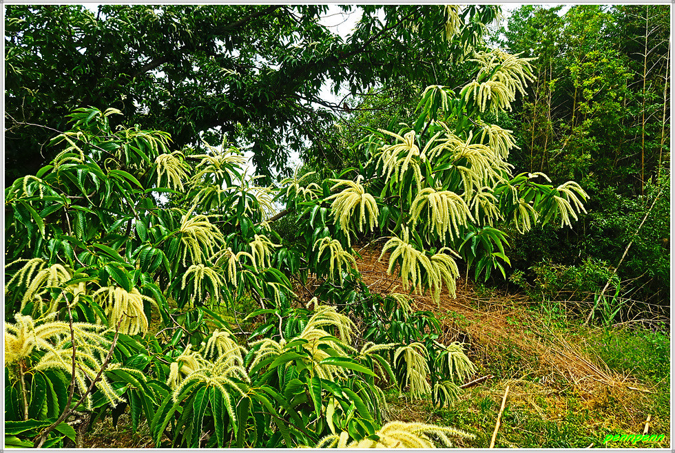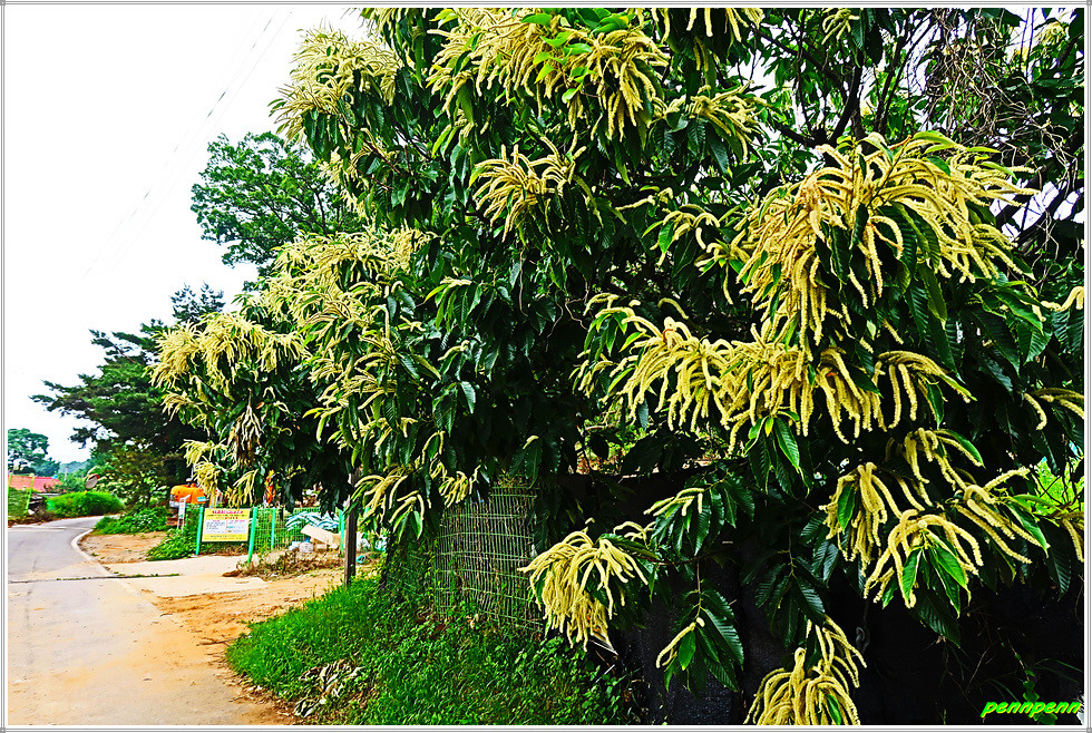 6-7월에 피는 밤나무꽃은 흰색이나 옅은 노란색을 띠며,