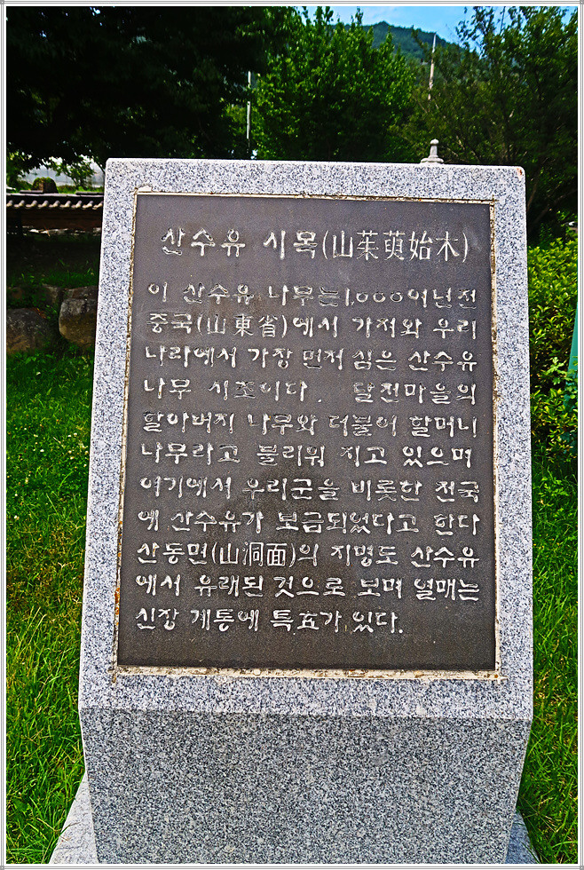 전남 구례군 산동면 계천리 계척마을 소재 산수유 시목지에는 수령 1,000년이 지난 보호수 산수유나무가 있는데 이는 우리나라에서 가장 먼저 심은 산수유 시조나무로 이로 인해 전국으로 산수유나무가 보급되었다는 것입니다. 이 나무는 높이가 7m, 둘레가 무려 4.8m에 달하는 노거수랍니다.