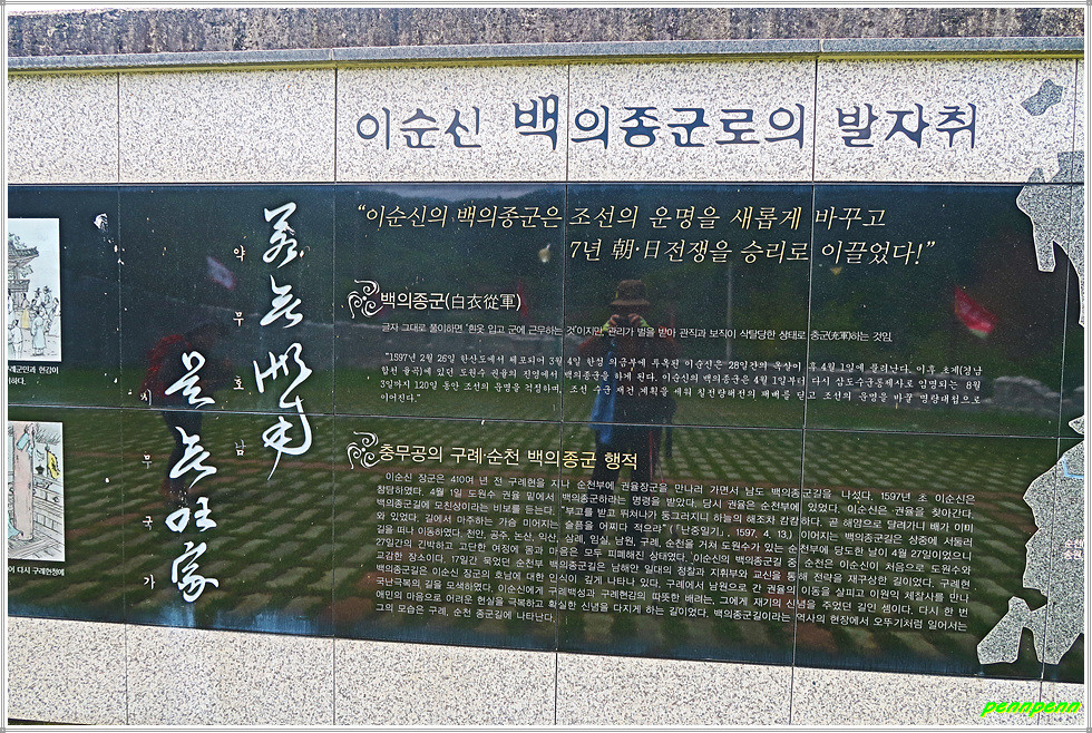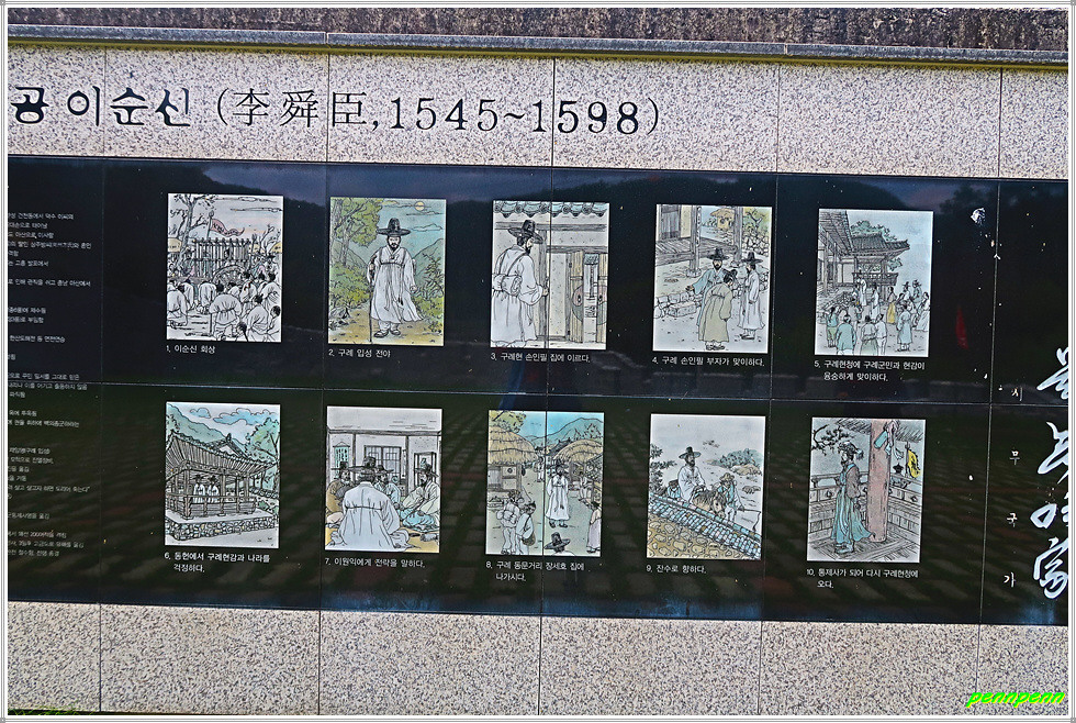 그 아래쪽에는 이순신 장군의 백의종군로의 발자취와 이순신의 삶에 대한 기록을 벽면에 새겨 놓고 있는데, 1597년 이순신 장군은 모친상을 당한 후 천안, 공주, 논산, 익산, 삼례, 임실, 남원, 구례를 거쳐 권율 도원수가 있는 순천부에 당도했답니다. 이후 그는 삼도수군통제사로 임명될 때까지 120일 동안 전열을 정비해 칠전량해전(1597년 7월 원균이 지휘한 조선수군이 왜군과 싸워 유일하게 패한 전투)의 패배를 딛고 명량대첩을 승리로 이끌어 전세를 역전시키게 됩니다.