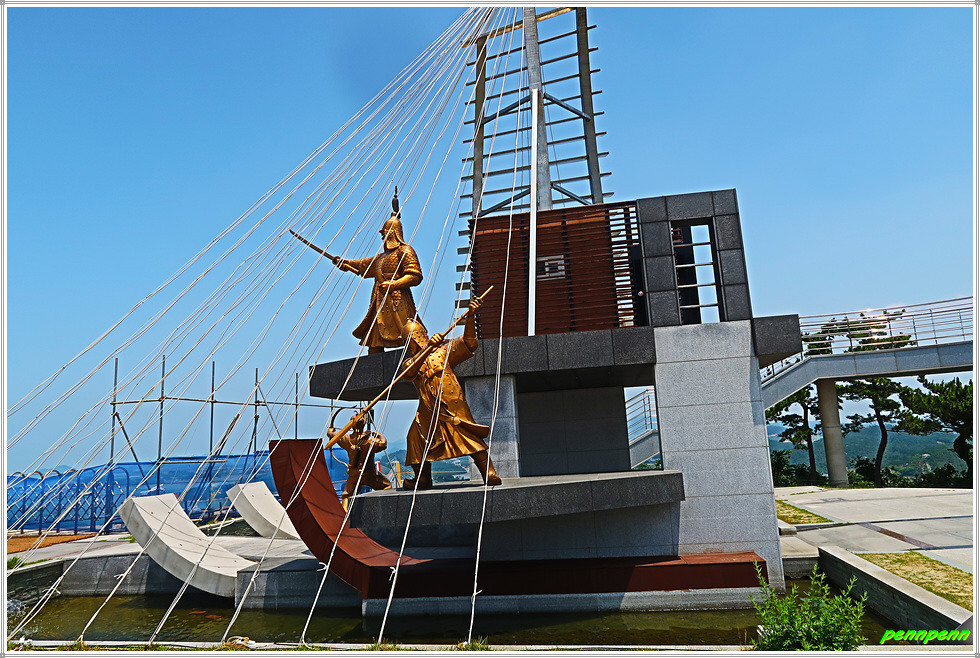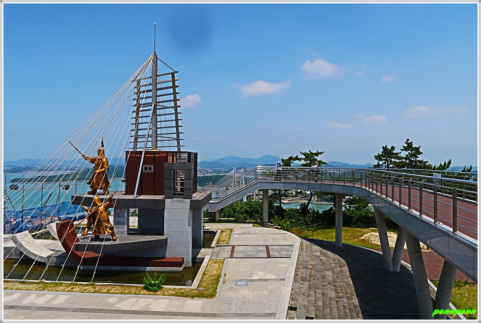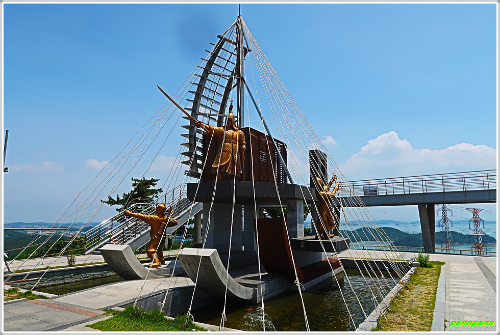 타워 광장 끝에는 명량대첩을 조형물로 표현한 시설물도 있군요. 시설물 옆에는 전망데크가 있는데 이곳에 오르면 명량대첩 조형물과 진도타워를 한꺼번에 볼 수 있습니다.