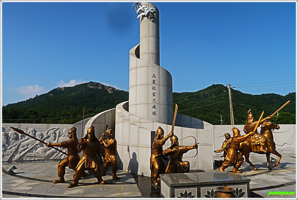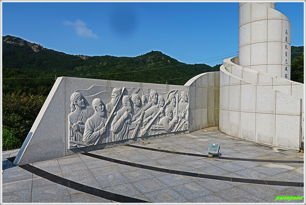 주차장 입구로 나와 소형주차장 쪽으로 갑니다. 먼저 배중손 장군의 동상이 방문객을 맞아주는군요. 배중손 장군(?-1271)은 고려 후기의 무장으로 삼별초(三別抄)군의 지도자였으며, 1271년 여몽연합군의 공격으로 이곳에서 전사한 인물입니다. 동상 옆에는 배중손 장군 사당 정문인 숭의문과 사당인 정충사(精忠祠)가 있고, 그 우측에는 배중손장군항몽순의비가 세워져 있습니다.