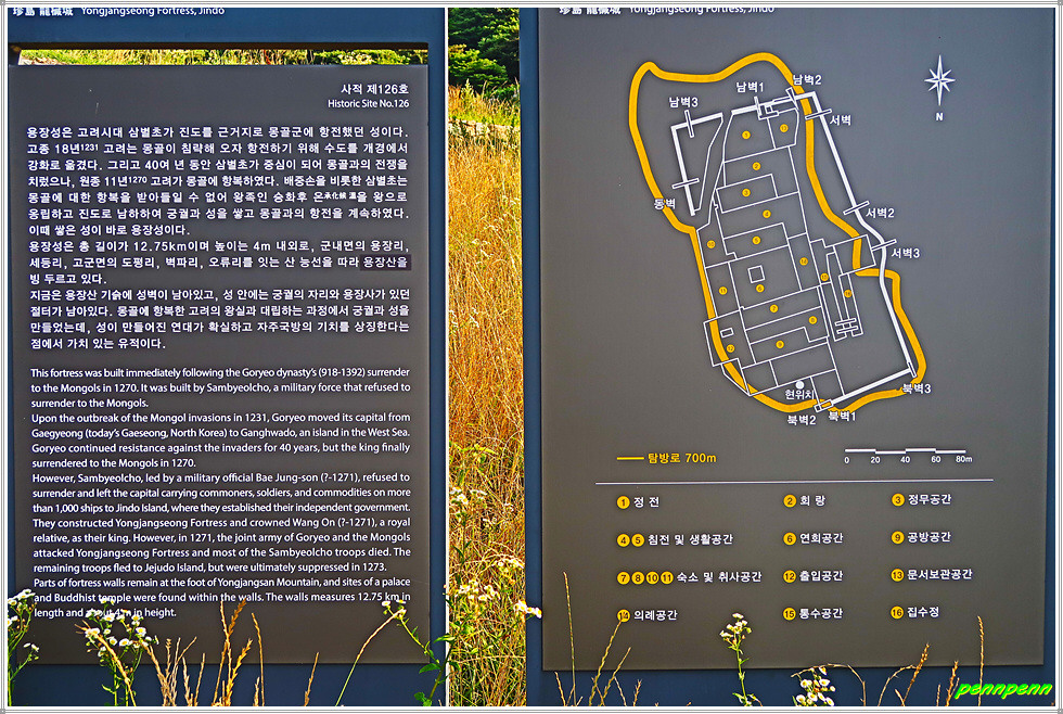 전남 진도군 군내면 용장리 소재 용장성(사적 제126호)은 고려시대 삼별초가 진도를 근거지로 관군과 몽고군에 항전했던 성으로 현재 성의 대부분은 원형이 사라진 상태이며, 성지가 부분적으로 남아 있고 성내의 용장사지 및 행궁지가 보존되고 있습니다. 고려 원종 때 몽고군의 침입을 받아 치욕적인 강화조약을 맺고 개경으로 환도하자 이에 반대한 삼별초군은 원종의 육촌인 온(溫)을 왕으로 추대하고 진도로 내려와 항거하는데 용장성은 고려의 장군 배중손(裵仲孫)이 이끈 삼별초군이 대몽항쟁(1270~1271)의 근거지로 삼은 성입니다.