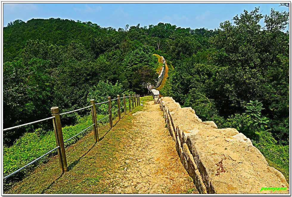 서문에서 성곽 바깥쪽의 길을 오르면 잠시 후 복원된 성곽이 끝나는 데, 뒤돌아보니 지나온 남산의 남장대가 선명하게 보입니다. 그런데 이쪽에는 장독대와 화사한 연꽃이 한 송이 피어 있어 여행자를 감동시킵니다. 장독대에서 좌측으로 내려가 도로를 만나 후 다시 숲으로 진입하면 자연상태 그대로의 산성입니다.