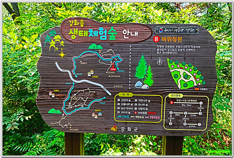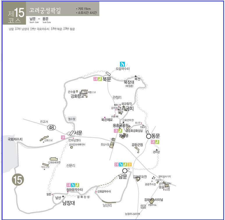 ▲ 코스 : 강화산성 남문-남산1리 마을회관-선화골 약수터-산성삼거리-청하동약수터-남암문-잣나무숲-삼거리갈림길-남산 남장대(왕복)-남산리공설묘지-국화저수지-강화석수문-연무당 옛터-서문-북문-북장대터-나들길 갈림길-바위정원-고려궁지-용흥궁-동문
