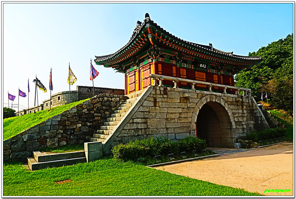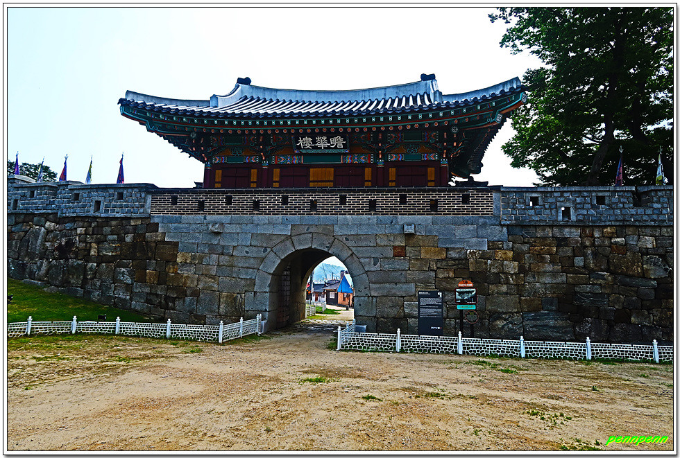이제 강화산성 서문을 둘러볼 차례입니다. 강화산성 서문은 첨화루(瞻華樓)로 숙종 37년(1711)에 건립되어 그동안 퇴락되었다가 1977년에 개축된 것입니다. 첨화루 통로의 천장에는 호랑이그림이 그려진 게 특이하군요. 첨화루는 “아름다움을 본다”라는 뜻이라고 합니다.
