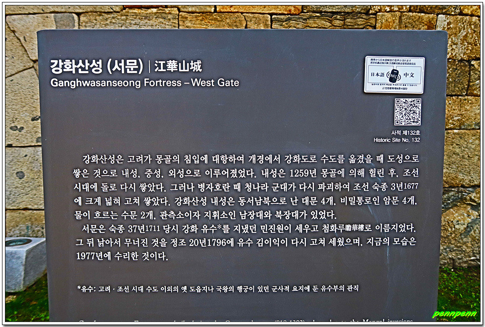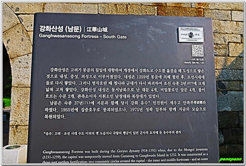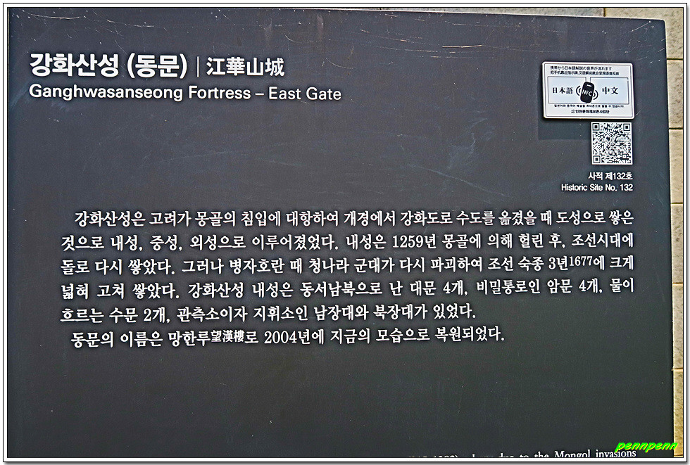 강화산성 동문은 망한루(望漢樓)로 그간 전쟁으로 없어진 것을 2004년 복원한 것입니다. 동문 뒤쪽에는 강도동문이라는 현판이 걸려 있네요. 이곳에는 15코스 완주 도장함이 있습니다. 오늘 11km를 걷는데 4시간 반이 소요되었습니다. 삼복더위여서 나들길 중 거리가 가장 짧은 코스를 선택해 걸었지만 땀을 많이 흘리다보니 무척 지쳤습니다. 이럴 때는 충분히 쉬면서 수분섭취를 많이 하는 게 좋습니다.