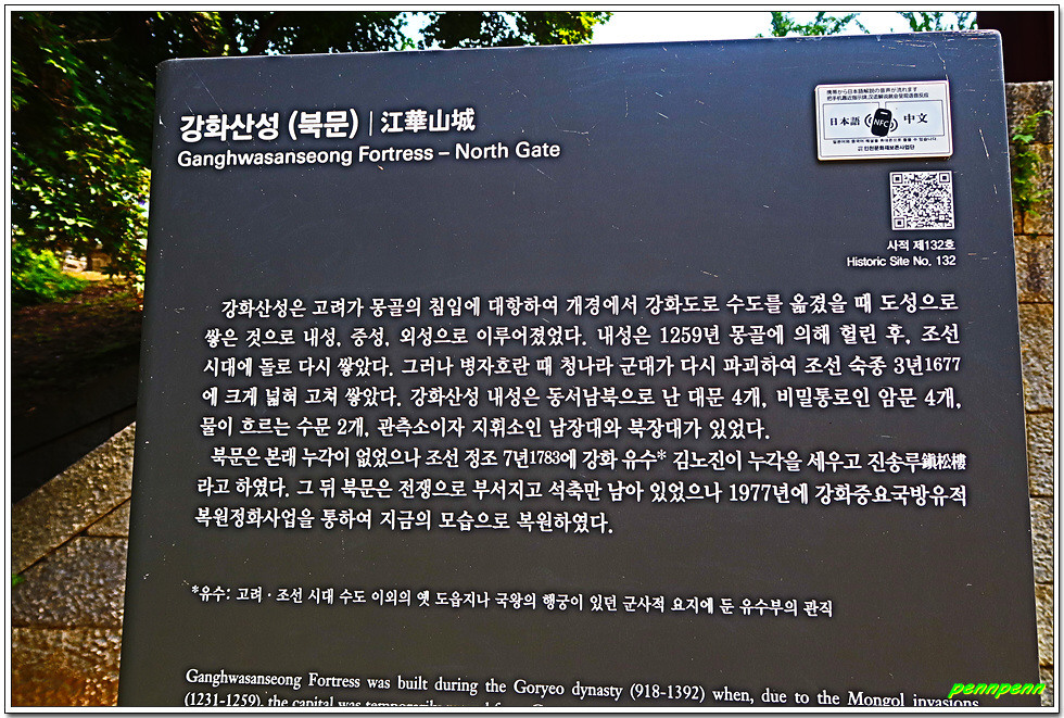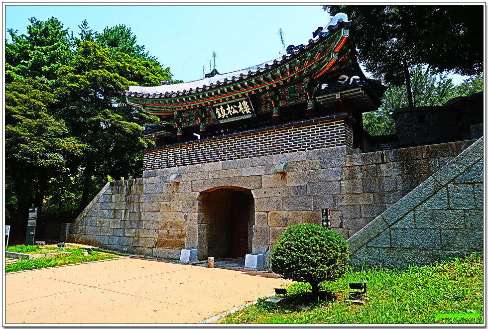 북문은 진송루(鎭松樓)로 원래는 누각이 없었지만 조선 정조 7년(1783) 강화유수 김노진이 누각을 세우고 진송루라고 하였습니다. 그 뒤 북문은 전쟁으로 부서지고 석축만 남아 있던 것을 1977년에 복원한 것입니다. 이곳에는 고려궁 성곽길을 알리는 조형물이 세워져 있지요.