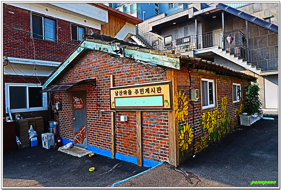 여기서 나들길은 남쪽의 2차선 마을도로로 이어집니다. 도로변에는 고려충절의 역사를 간직한 남산마을이라는 글씨가 새겨져 있네요. 남산1리 마을회관 맞은편에는 해바라기 벽화가 그려진 주민게시판이 있는데 이 게시판 맞은편 남산원룸 옆 골목에 수령 약 300년으로 추정되는 구신골 느티나무가 보입니다. 그런데 이 느티나무 바로 우측 골목이 선화골 약수터로 가는 올바른 길이지만 필자는 전신주 옆에 훼손된 채 걸려 있는 이정표를 보지 못하고 계속 도로를 따라 직진하다가 나들길 리본이 전혀 보이지 않아 길을 잃은 것을 직감하고는 되돌아와 이를 발견하고는 선화골로 진입했습니다.