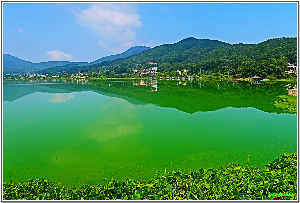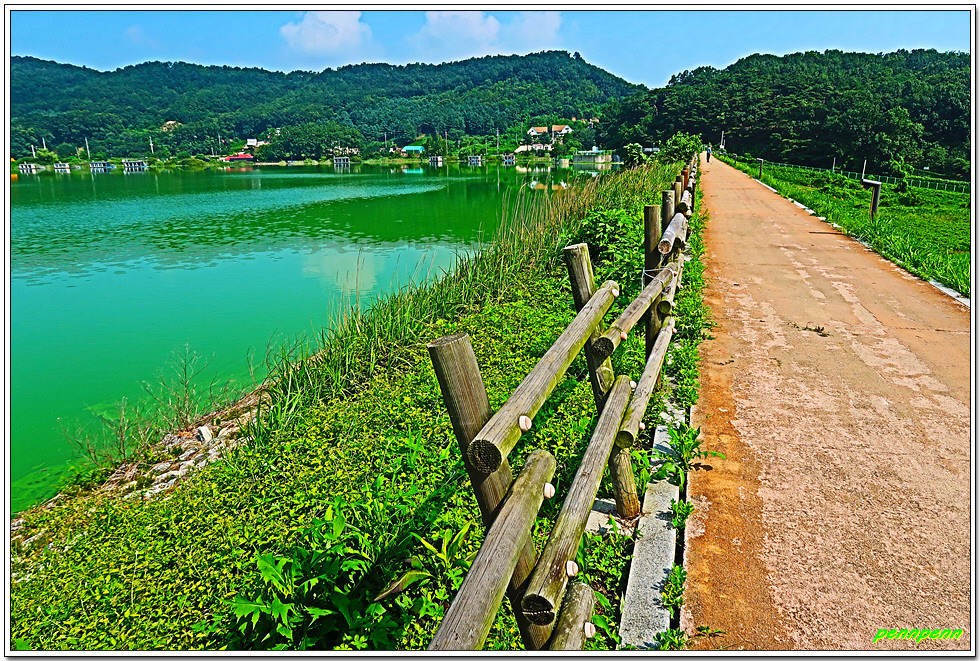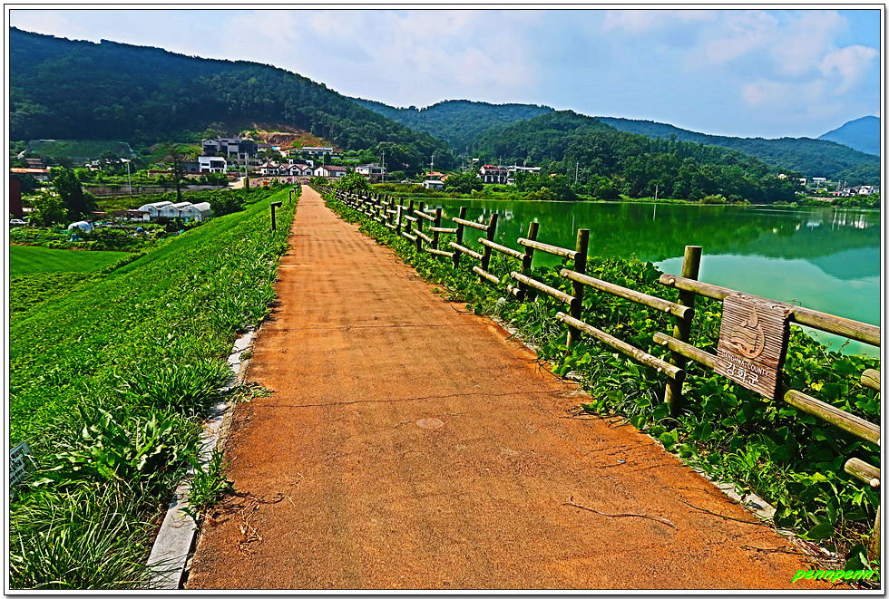 삼거리 갈림길로 되돌아와 남서쪽으로 내려가면서 남산리공설묘지를 지나갑니다. 한참동안 숲길을 걸어 내려와 도로를 만난 후 발걸음을 옮기면 강화 국화저수지입니다. 강화읍 국화리 소재 국화저수지는 1978년 강화군의 식수원 및 농업용수로 사용하고자 축조된 저수지로 서 물이 깨끗하고 주변 경치가 아름답습니다. 2010년 강화군과 농어촌공사 노력으로 3km에 달하는 산책로와 수생식물자연학습장 등 생태문화로를 조성했습니다. 나들길 15코스는 저수지 둑 위로 지나가는데, 저수지의 물이 진한 녹색을 띠는 것은 아마도 녹조현상 때문인 것으로 보여집니다.