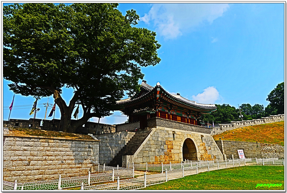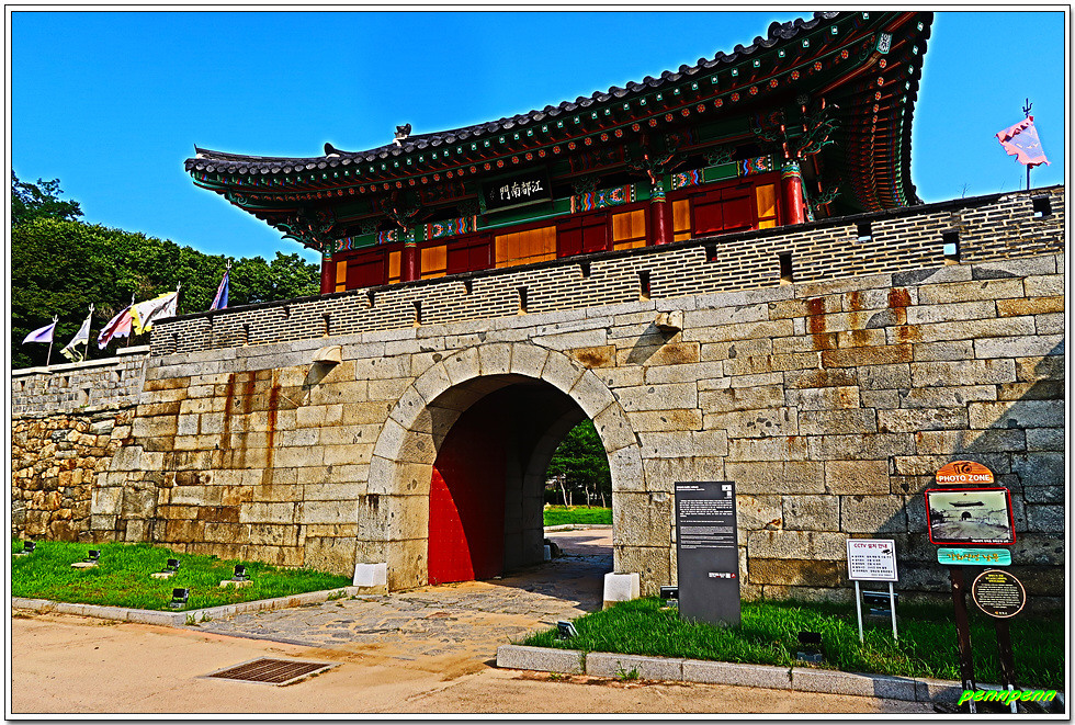 15코스의 들머리는 원래 강화산성 남문이지만 대중교통을 이용할 경우 강화터미널에서 시작해 남문으로 갑니다. 강화읍 남산리 소재 남문에는 안파루(晏波樓)라는 현판이 걸려 있는데, 숙종 37년(1711)에 건립되었으나 1955년 홍수 때 무너진 것을 1975년에 복원한 것입니다. 이곳 남문에 도보여권용 스탬프함이 있으며, 남문 옆에는 수령 450년이 넘는 노거수 느티나무가 묵묵히 남문을 지켜보고 있지요.