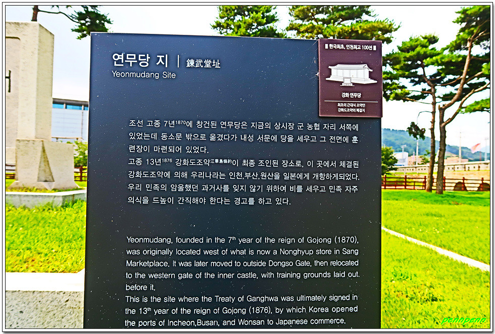 강화산성 서문 바로 남쪽에는 연무당 옛터가 있는데 연무당은 1870년 (고종 7년) 강화유수부 군사들을 훈련시키기 위해 세워진 조련장으로 1876년 일본의 강압에 의해 강화도조약이 맺어진 장소입니다. 강화도조약은 조선이 외국과 맺은 최초의 근대적 조약이었으나 이로 인해 인천, 부산, 원산을 일제에게 개항하고 치외법권을 인정한 불평등조약이었습니다.