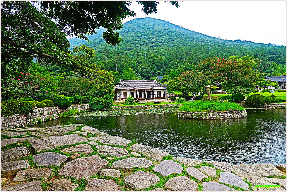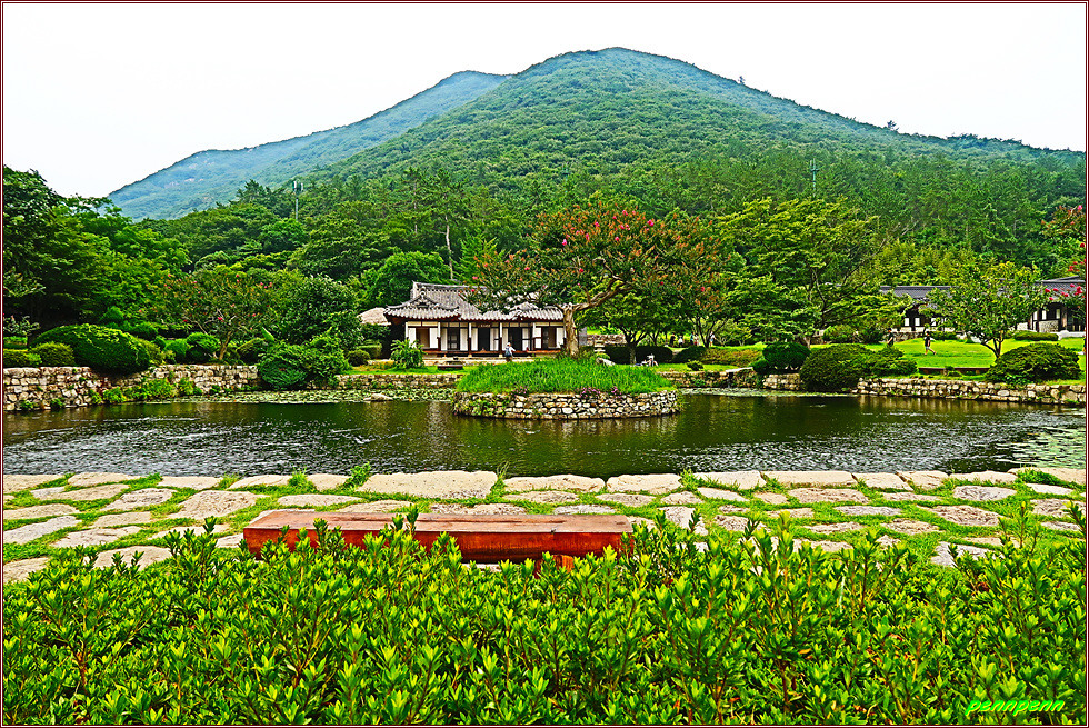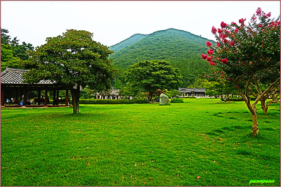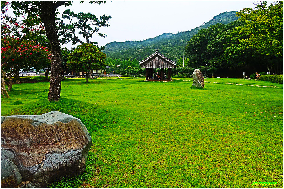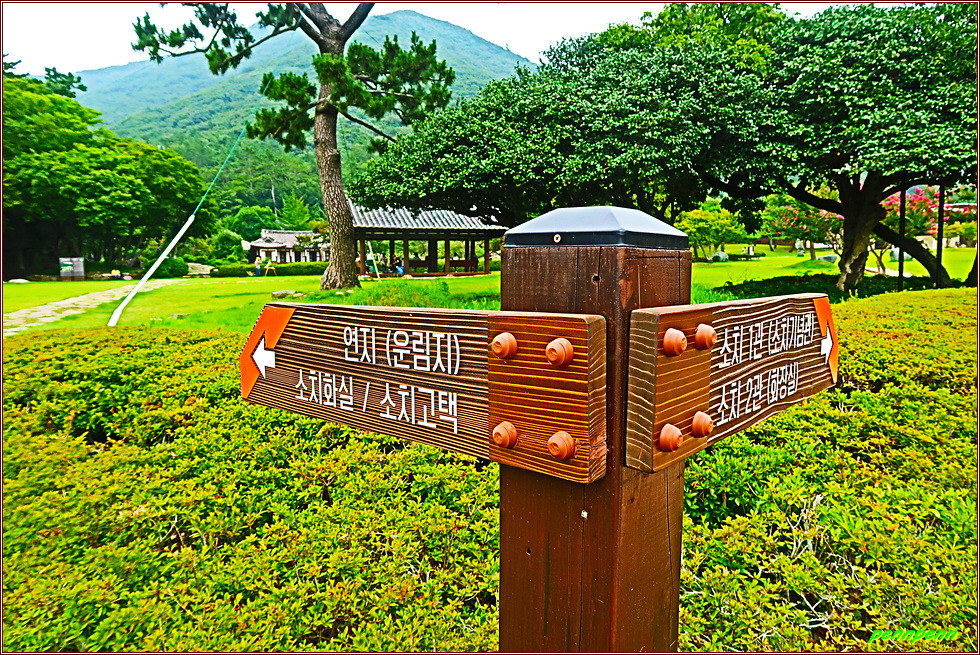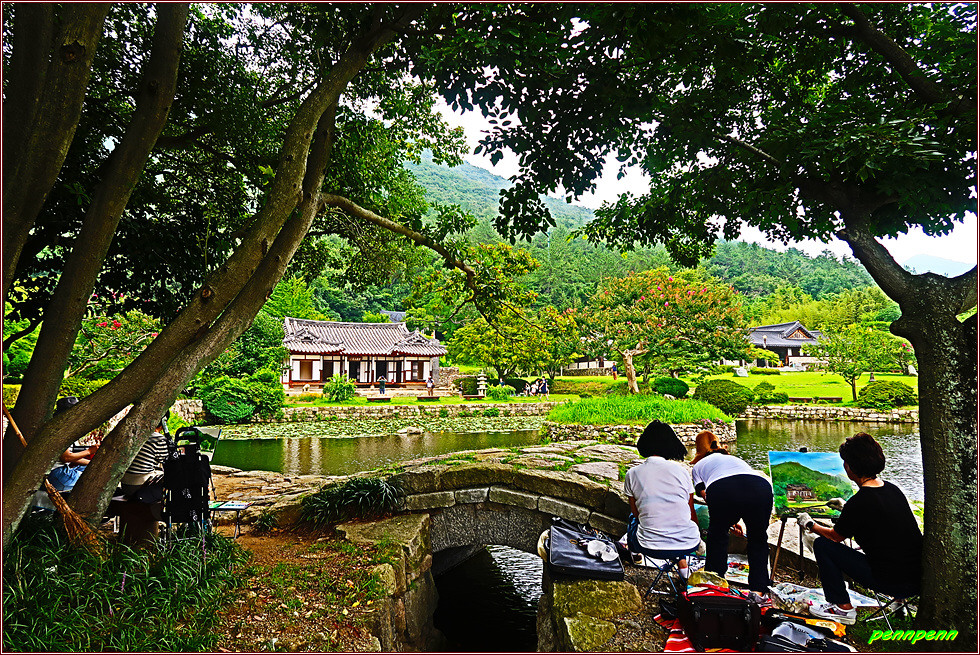매표소를 들어서면 바로 좌측에 보이는 반듯한 기와집은 몽연각으로 판매장 및 체험장입니다. 우측의 관리사무소를 지나면 갈림길인데, 먼저 연지 방향으로 갑니다. 연지(운림지)는 화실인 운림산방 앞에 있는 작은 연못인데요. 이곳은 뒤로 보이는 첨찰산을 배경으로 운림산방 한옥과 잘 어우러져 멋진 경치를 보여주기 때문에 사진작가 또는 화가들의 단골 방문장소로 널리 알려져 있습니다. 이날은 날씨가 매우 흐렸지만 소치 허련을 꿈꾸는 여러 화가(지망생)들이 붓을 들고 그림을 그리고 있더군요. 이곳은 연못과 정원이 어우러져 영화 "스캔들" 촬영장소이기도 했습니다.