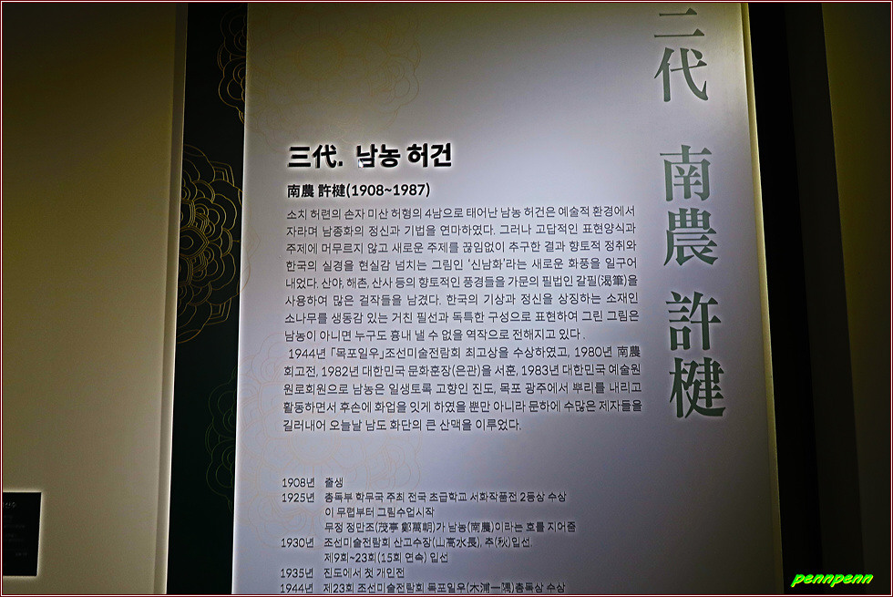 맨 우측에는 소치2관이 있는데, 이곳은 소치일가의 직계가족화가 전시실입니다. 소치 일가는 허련의 후손인 2대 미산 허형, 3대 남농 허건(운림산방 복원자), 임인 허림, 4대 임전 허문, 5대 허진, 허은, 허청규, 호재, 허준 등입니다. 이곳에는 많은 작품들이 전시되어 있었지만 그 중 일부만을 소개합니다.