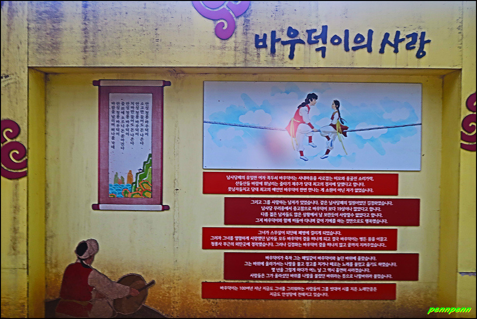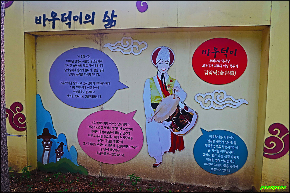 좌측 안쪽에는 줄타기와 그네, 풍물놀이를 재현한 등신대, 풍물놀이장면을 그림으로 표현한 의자, 남사당패와 바우덕이의 일생에 관련한 자료가 벽화형식으로 진열되어 있습니다. 전해오는 이야기에 의하면 1865년(고종2)년 경복궁 중건공사에 지친 노역자들을 위로하기 위해 전국의 남사당패를 불러들여 공연을 펼쳤는데 바우덕이는 뛰어난 공연으로 고종과 흥선대원군으로부터 정3품에 해당하는 옥관자를 하사받았습니다. 이후에도 전국을 돌면서 남사당을 대중공연으로 발전시키는데 큰 공을 세웠지만 힘든 유랑생활 속에서 폐병을 얻어 안타깝게도 22세의 젊은 나이에 요절하고 말았습니다.
